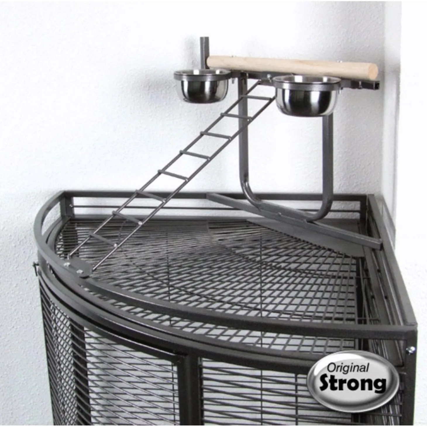 Deze hoekkooi is een handige papegaaienkooi voor als je weinig ruimte hebt. Doordat je hem in de hoek kan zetten bespaar je veel ruimte in je woonkamer! Het hok beschikt over vier RVS voederbakjes en is gemakkelijk te verplaatsen door de kunststof rolwielen. De voerbakjes zijn van buitenaf bereikbaar door middel van de draaideurtjes en bevatten stevige sloten. Zo kan je het eten en drinken verversen zonder de kooi open te maken! Het halve maan slot aan de voorzijde van de kooi houdt de deur stevig op zijn plaats en is niet gemakkelijk open te maken door jouw vogel.