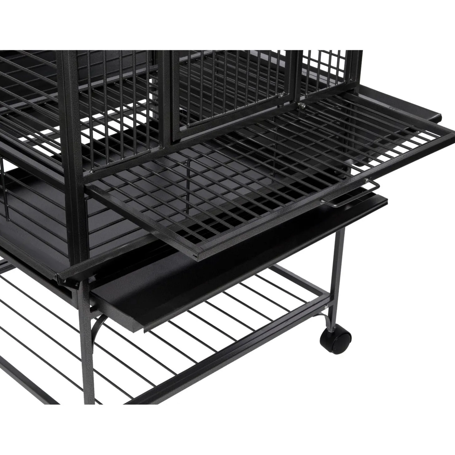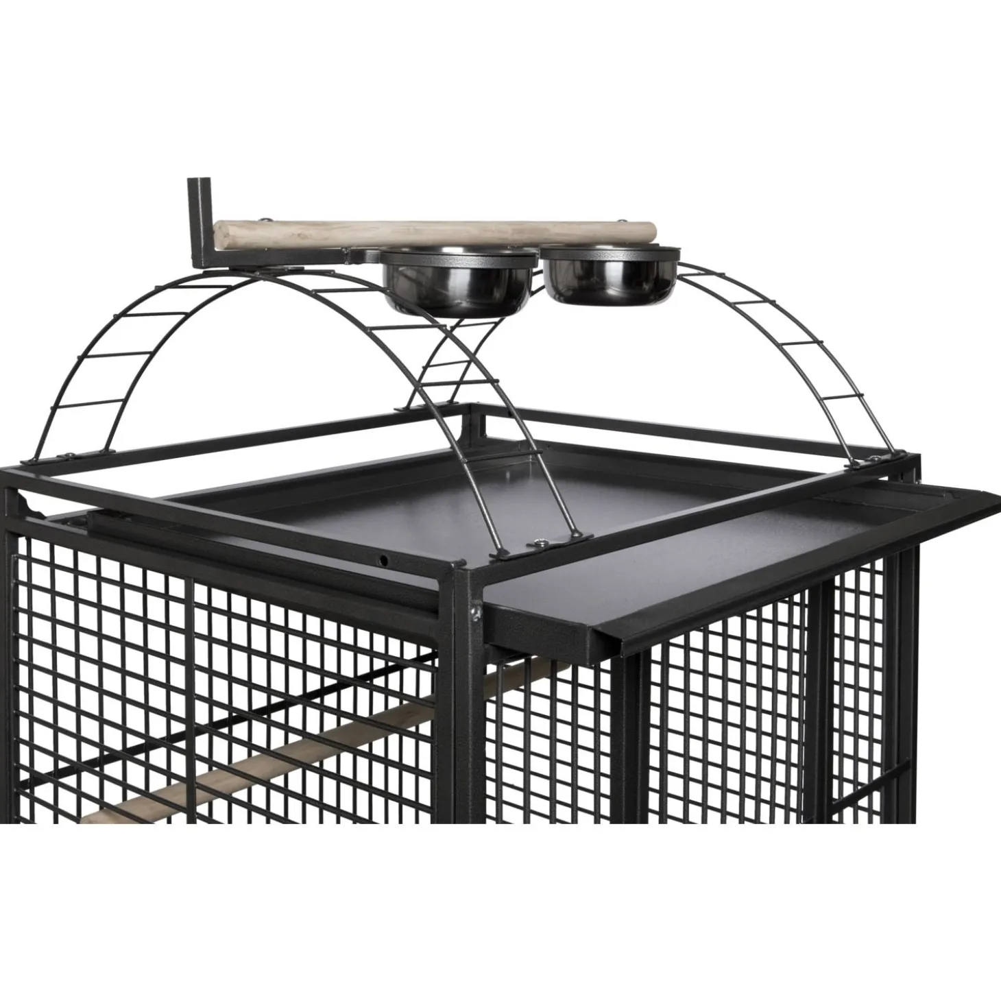 Als je vogel los vliegt kan hij rusten op de leuke speelplaats bovenop de kooi. Zo creëer je nog een extra zitplek voor je gevleugelde vriend en extra ruimte in de kooi zelf. Onder deze speelplaats zit een schuiflade waarin je bijvoorbeeld houtsnippers kan doen. Zo kan je vogel lekker scharrelen en vang je gelijk de ontlasting en gemorste voeding op als hij op de speelplaats zit. Om meer licht in de kooi te creëren kan je deze lade eruit halen! De bovenkant van de kooi is gewoon afgesloten met tralies.