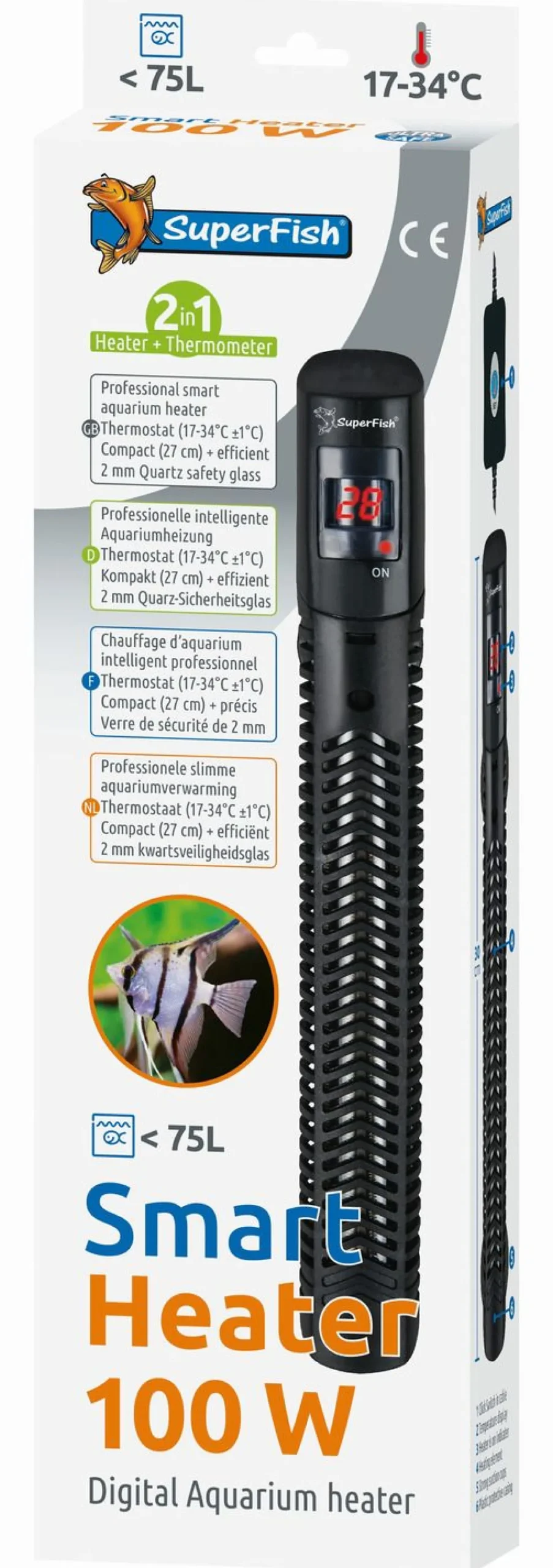De Smart Heater van Superfish verwarmt je aquarium met een constante temperatuur tussen de 17 en 34 °C én laat de temperatuur zien. De aquariumverwarming is makkelijk in gebruik en heeft een nauwkeurige temperatuurregeling. Verder heeft de heater 2 mm kwarts veiligheidsglas met een kunststofprotector. Ook heeft de heater een lange kabel en aan de voorkant zit een display waar je de temperatuur kunt aflezen.