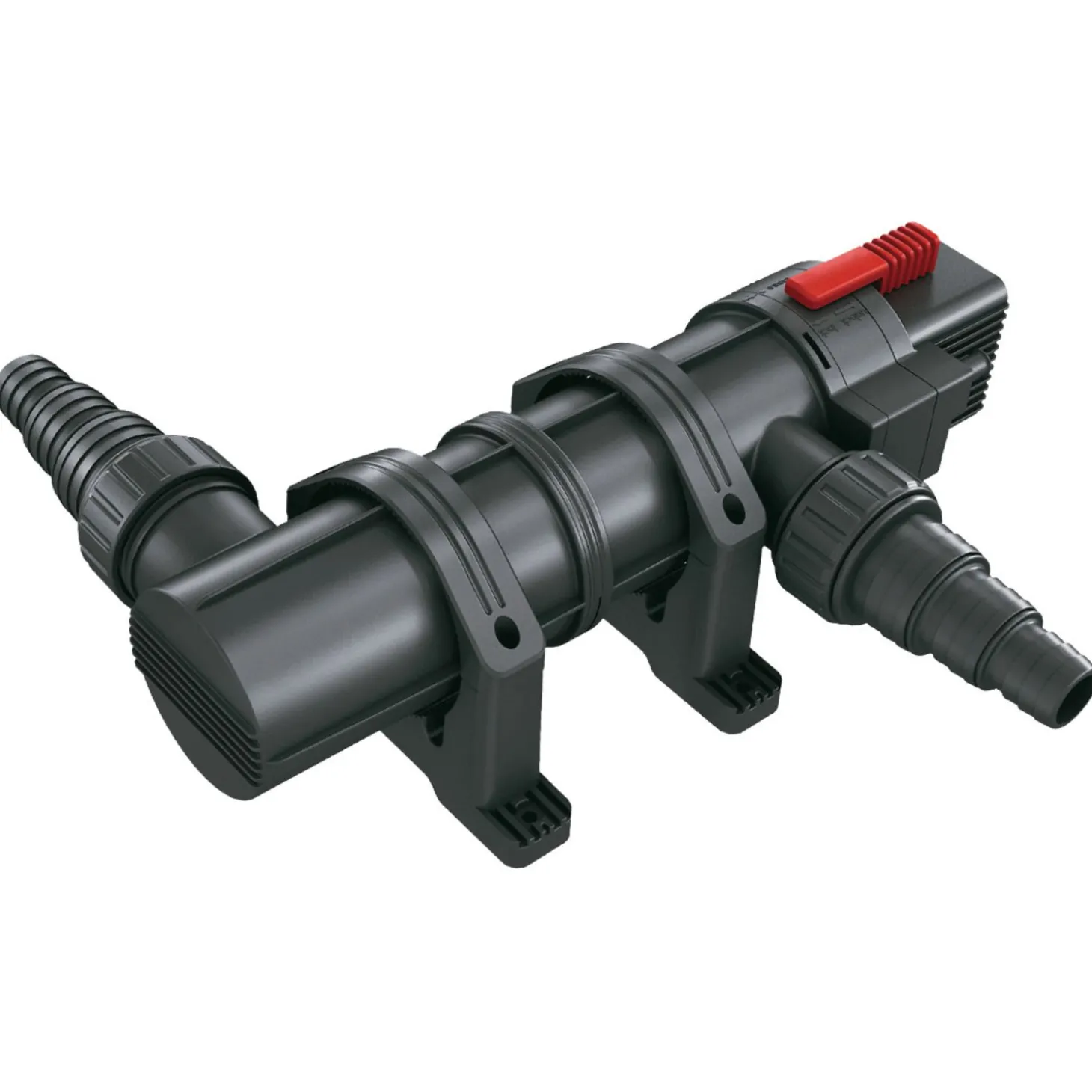 De Pond Clear heeft een maximale pompcapaciteit van 5000 l en wordt geleverd inclusief multistep slangaansluiting van 25/32/40 mm. Door de Pond Clear aan te sluiten op je vijverpomp, stroomt het water langs de UV-lamp die algengroei onder controle houdt en schadelijke bacteriën en ziektekiemen vermindert. Zo wordt je vijver weer helder en blijven je planten en vissen fit en gezond.