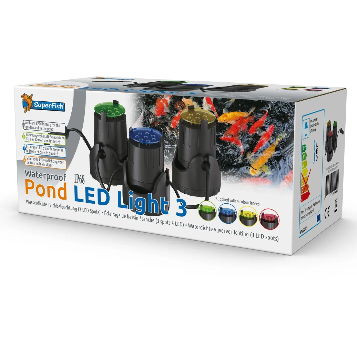 Je kan je vijver extra sfeervol maken met behulp van het juiste licht. Met het Vijver LED Light van Superfish breng je sfeer in je vijver en tuin. De energiebesparende lamp wordt geleverd met 4 verwisselbare kleurlenzen, zo kan je zelf kiezen welke kleur je het mooist vindt voor jouw vijver. Verder heeft de lamp een verstelbare kop voor het instellen van de stralingshoek. De lamp is geschikt voor zowel buiten- als onderwatergebruik en heeft 9 meter kabel.