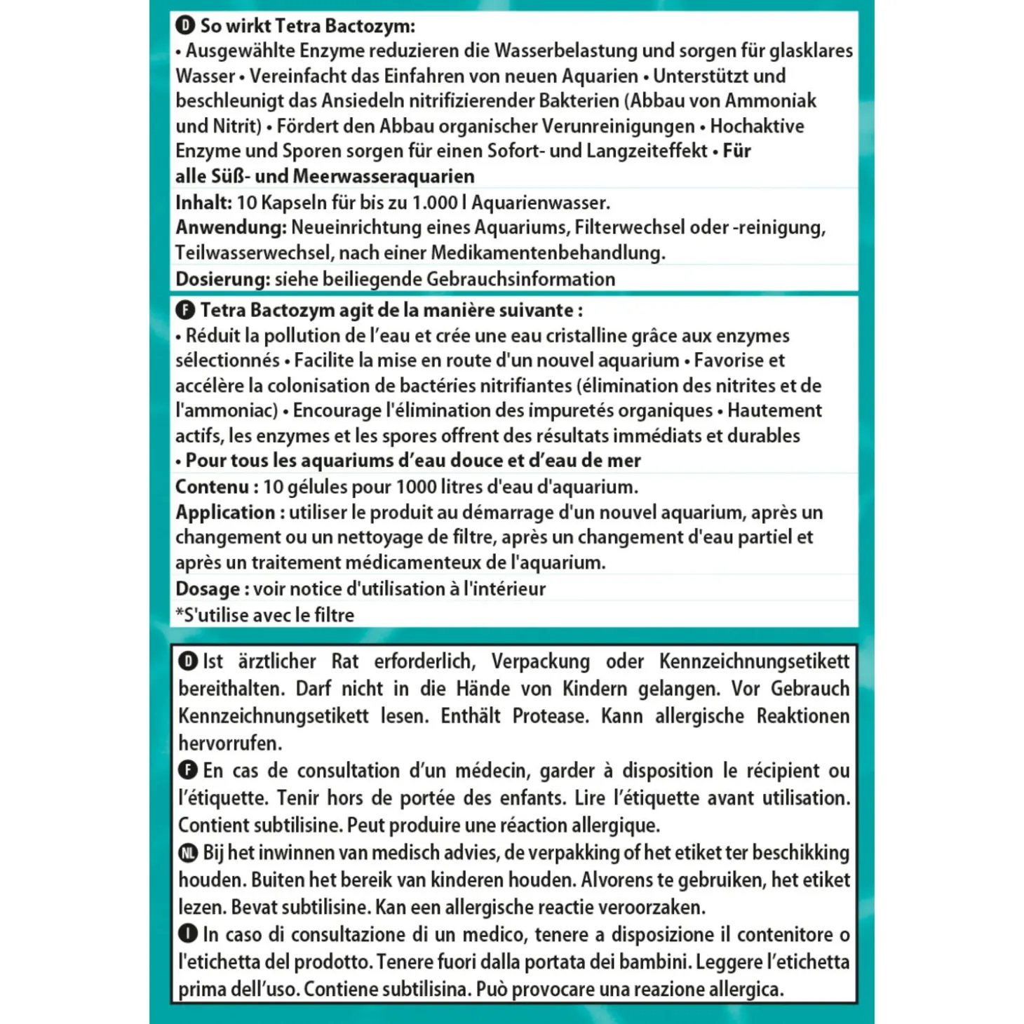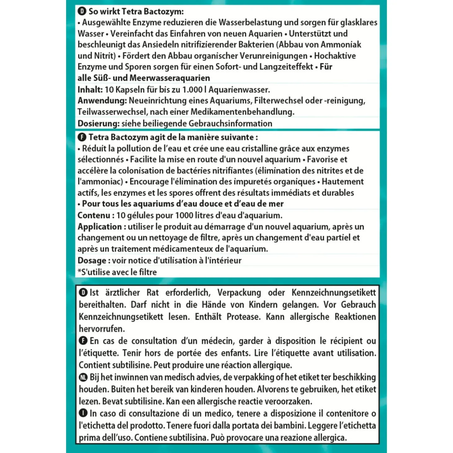 De Bactozym van Tetra draagt zorgt voor een biologische activiteit in het aquarium. Natuurlijk organische colloïden vormen een onzichtbaar laagje op het filtermateriaal en alle andere oppervlakken. Hierdoor stimuleren ze de nesteling van nuttige filterbacteriën. Daardoor kunnen de eerste vissen al na 24 uur in het nieuwe aquarium gezet worden. Het water verversen en het filter vervangen is mogelijk zonder ernstig verlies van de biologische activiteit. De geselecteerde enzymen zorgen voor minder waterverontreiniging en helder water. De door geneesmiddelen verzwakte of beschadigde micro-organismen worden weer gerevitaliseerd. Deze verbeterde formule met zeer actieve enzymen en sporen werkt direct en langdurig. Geschikt voor alle zoet- en zeewateraquaria.