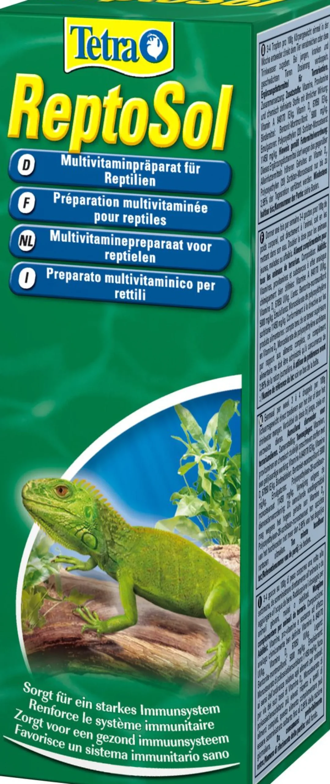 Zorg dat je reptiel alle vitaminen binnenkrijgt die deze nodig heeft met ReptoSol van Tetra. Dit aanvullend vloeibaar vitaminen-preparaat is geschikt voor alle reptielen. De ReptoSol draagt bij aan het verhogen van het weerstandsvermogen. Door de praktische druppelteller is het gemakkelijk toe te dienen aan de voeding van je reptiel.