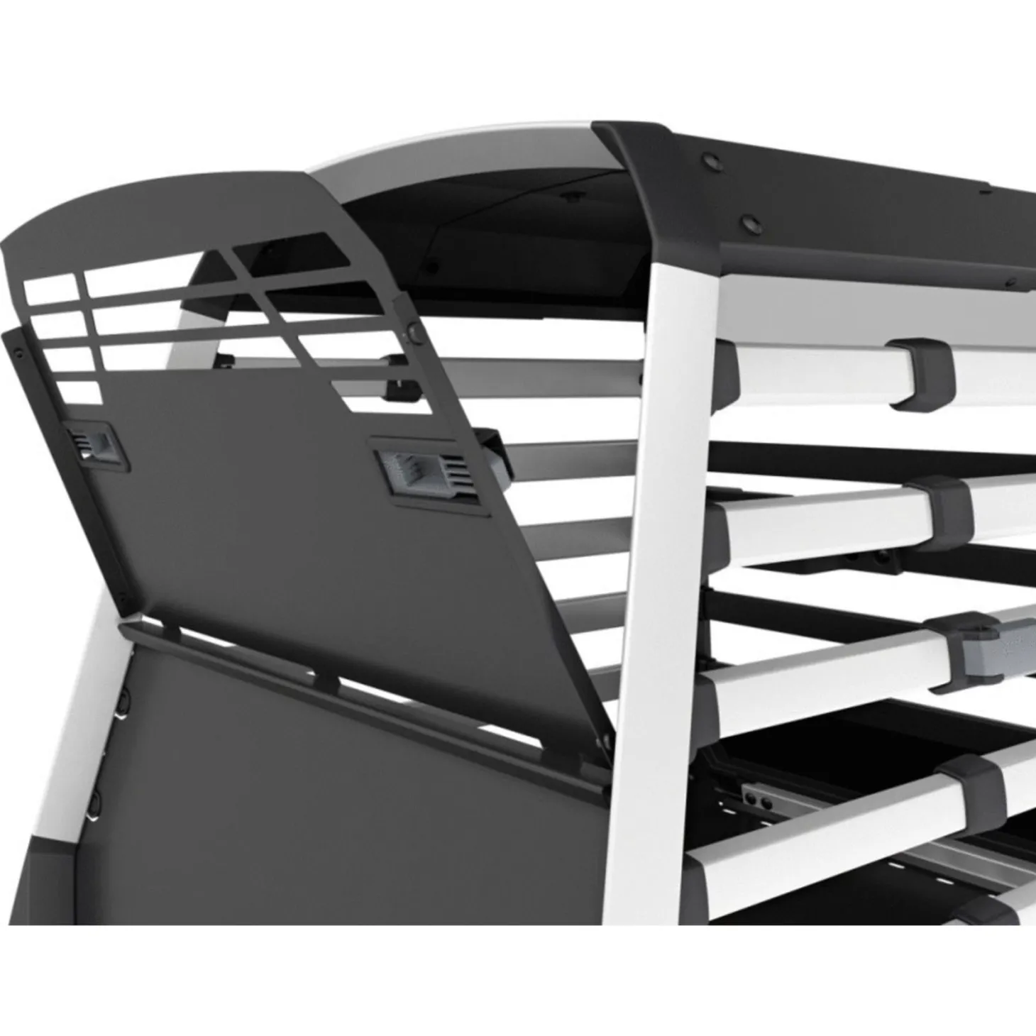 | Samenstelling | Eigenschappen:• Biedt bescherming aan de honden• Gasgedempte deur gaat zachtjes open en dicht• Voorzien van venster en openingen in de kooi• Voorzien van ontsnappingsluik aan de achterzijde• Aanpasbare diepte• Afmetingen: 87-93 x 70 x 69 cm• Gewicht: 24,3 kg• Draagvermogen: 45 kg |