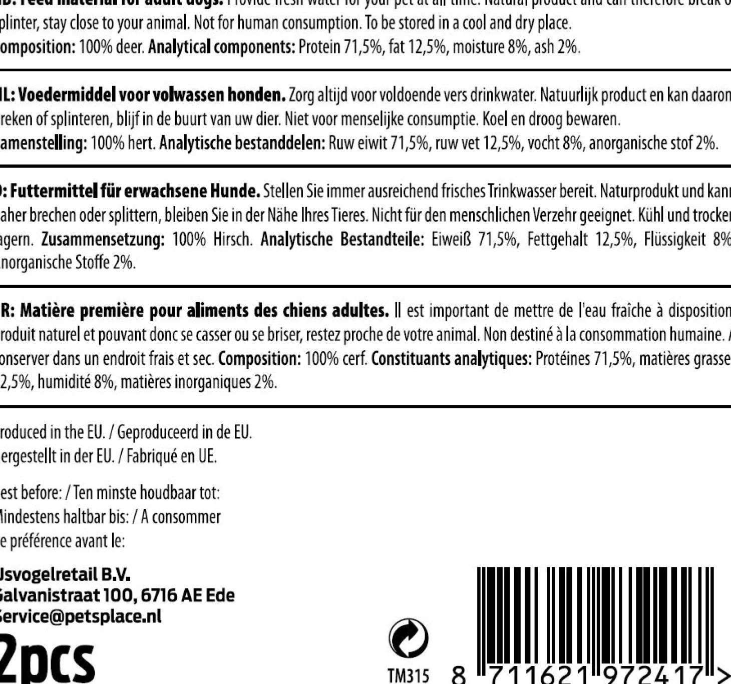 | Aanbeveling | De snack is niet geschikt voor honden jonger dan 3 maanden oud. Zorg altijd voor vers water voor je hond. Bewaar de snack koel en droog. Niet geschikt voor menseljike consumptie. |