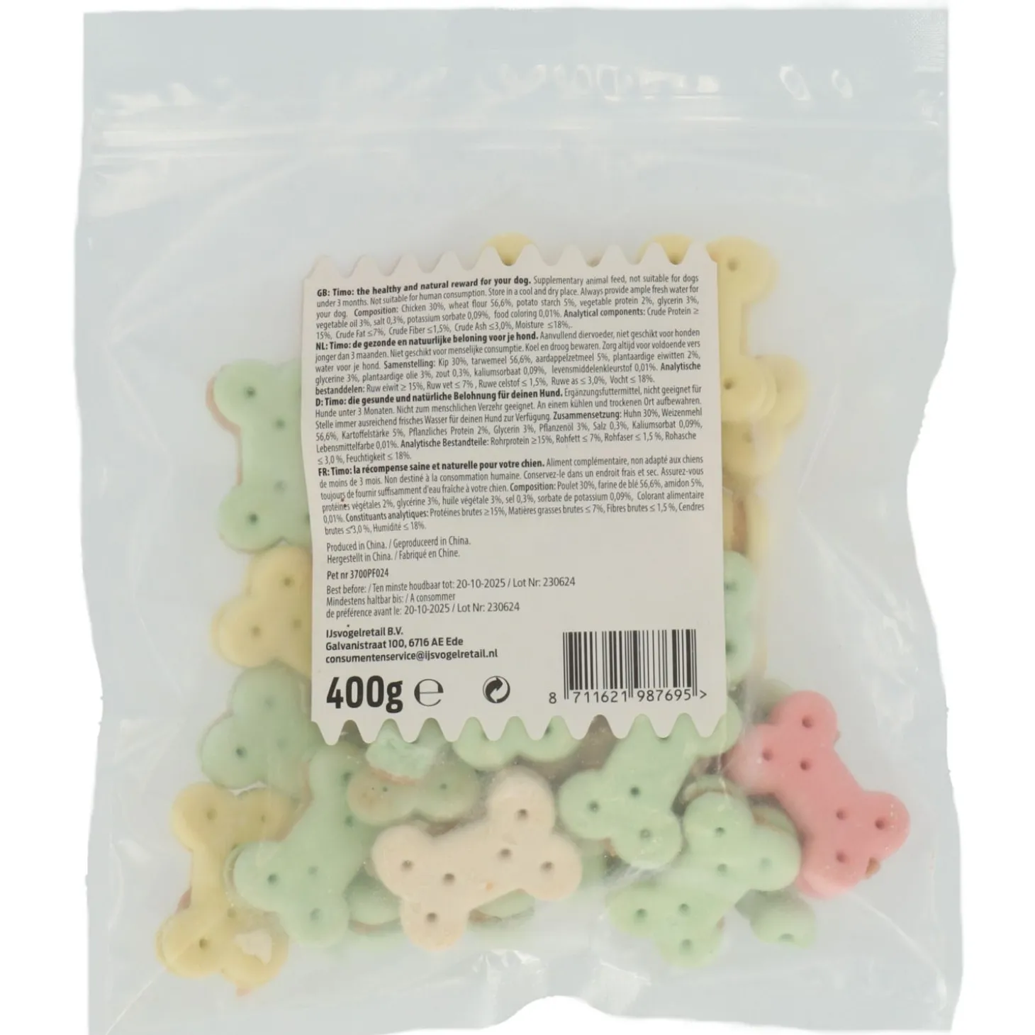 | Samenstelling | Kip 30%, tarwemeel 56,6%, aardappelzetmeel 5%, plantaardige eiwitten 2%, glycerine 3%, plantaardige olie 3%, zout 0,3%, kaliumsorbaat 0,09%, levensmiddelenkleurstof 0,01% |