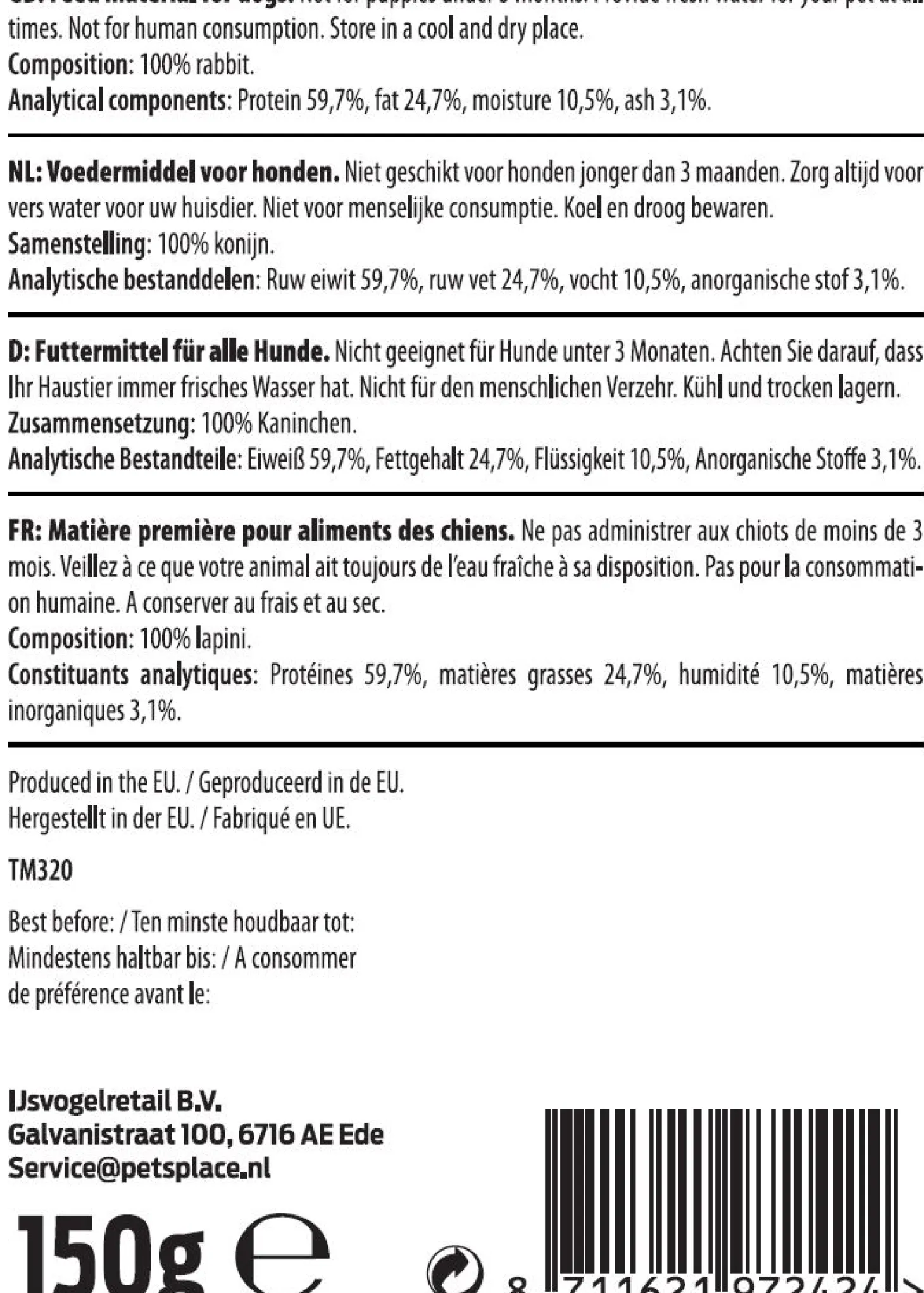 | Aanbeveling | De snack is niet geschikt voor honden jonger dan 3 maanden oud. Zorg altijd voor vers water voor je hond. Bewaar de snack koel en droog. Niet geschikt voor menseljike consumptie. |