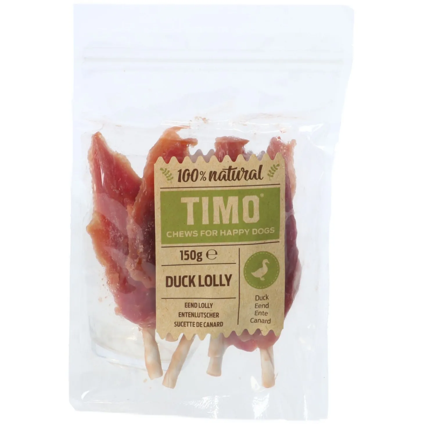 | Samenstelling | Eend 70%, ruwe huid 18%, zetmeel 3%, plantaardige eiwitten 2%, tarwemeel 1,5%,glycerine 3%,sorbitol 2% zout 0,4%, kaliumsorbaat 0,1% |