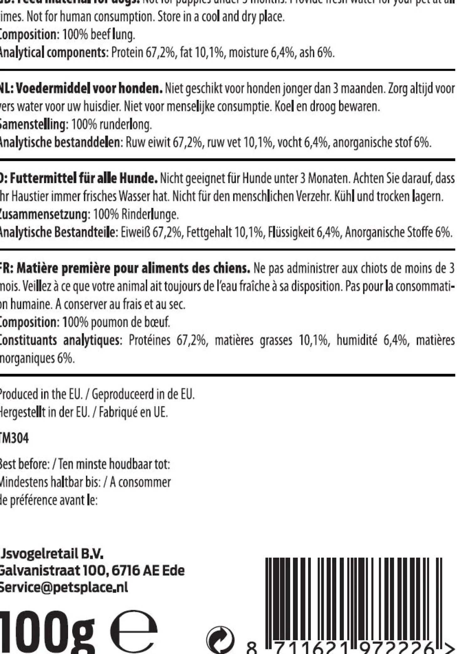 | Aanbeveling | De snack is niet geschikt voor honden jonger dan 3 maanden oud. Zorg altijd voor vers water voor je hond. Bewaar de snack koel en droog. Niet geschikt voor menseljike consumptie. |