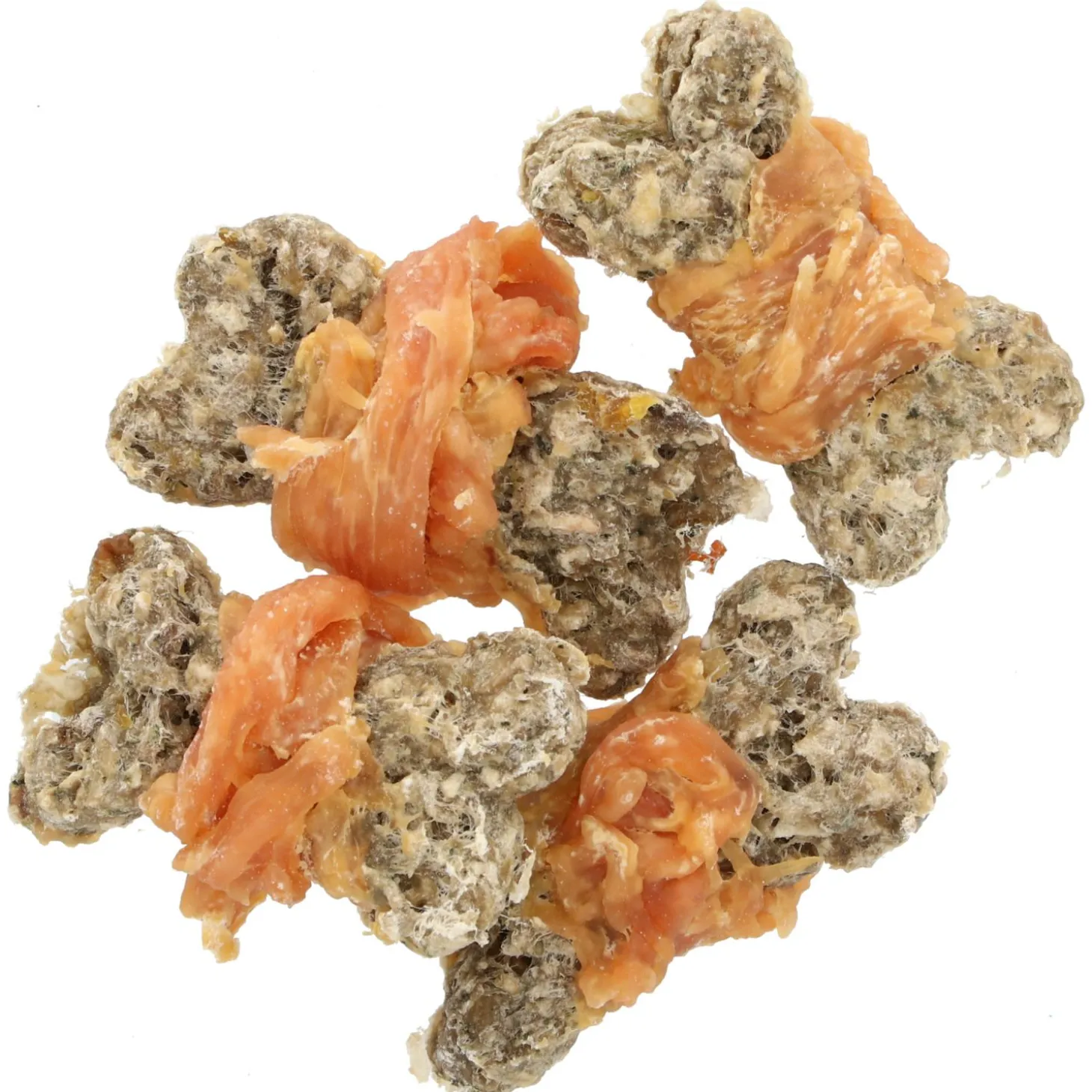 | Samenstelling | Runderhuid 51,2%, kip 30%, zoete aardappel 12%, spinazie 2%, plantaardige eiwitten 2,5%, tarwemeel 0,5%, glycerine 1%, sorbitol 0,5%, zout 0,2%, glucosamine 0,02%, chondroïtinesulfaat 0,02%, kaliumsorbaat 0,06% |