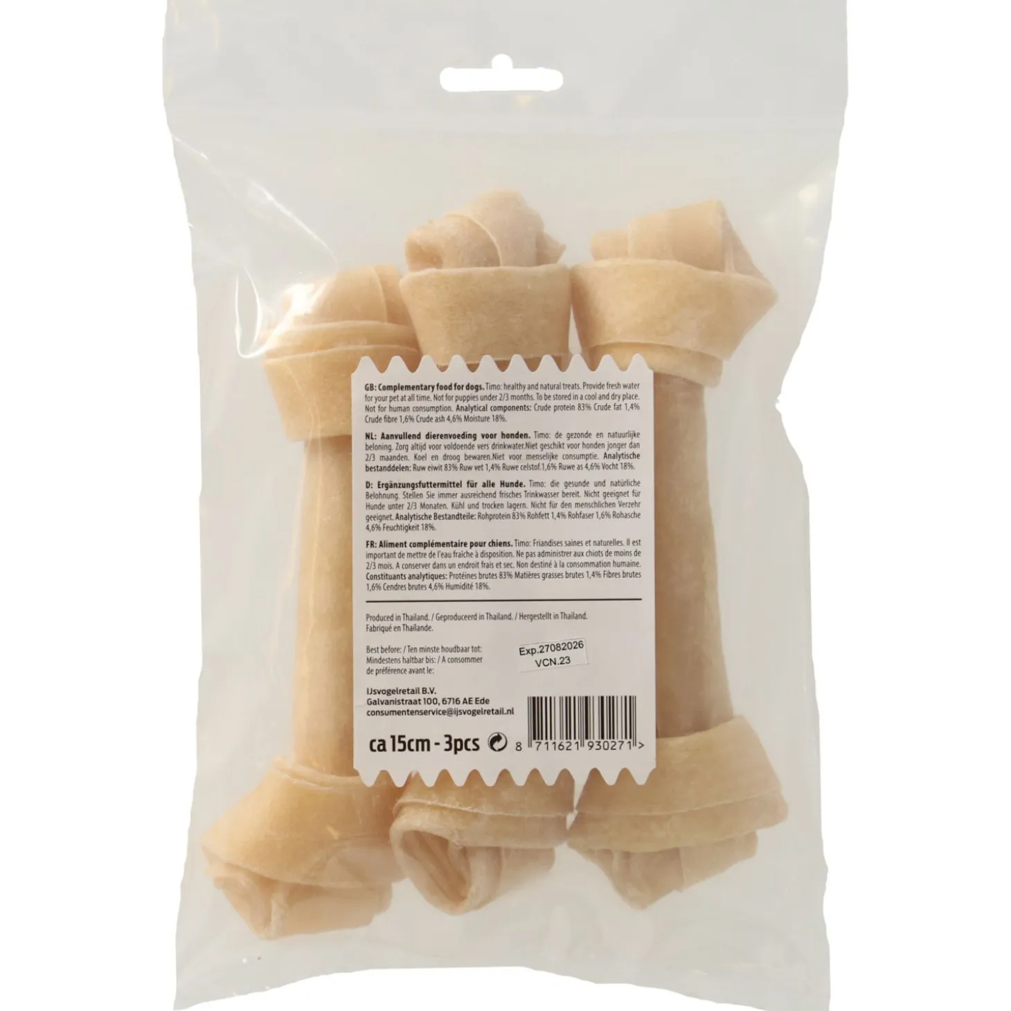 | Aanbeveling | De snack is niet geschikt voor honden jonger dan 3 maanden oud. Zorg altijd voor vers water voor je hond. Bewaar de snack koel en droog. Niet geschikt voor menseljike consumptie. |