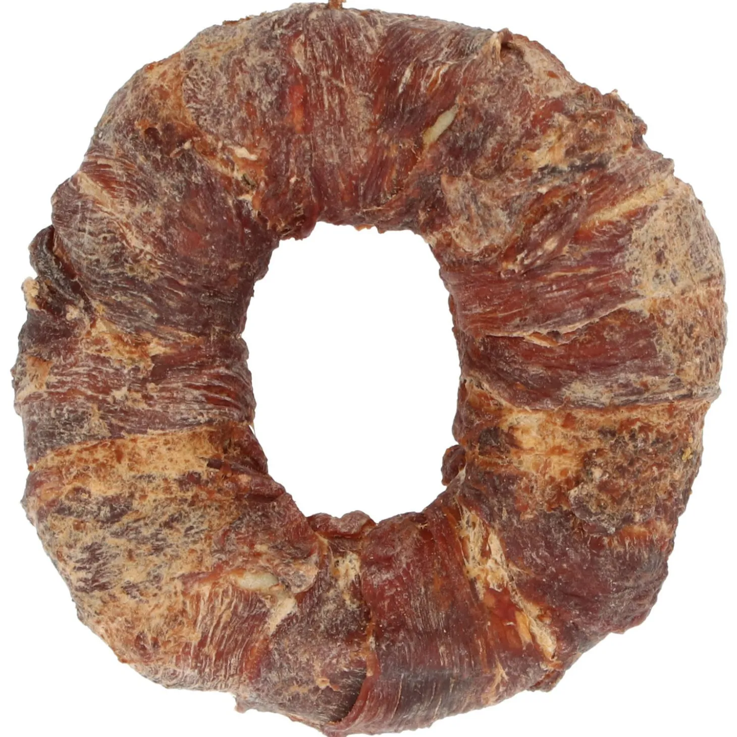 De donut is gemaakt van verschillende lagen runderhuid die uiteindelijk zijn samengeperst en opgerold tot een heerlijke cirkel; met daaromheen gedroogd vlees voor nog meer kauwplezier. Naarmate erop de stick gekauwd wordt, des te zachter deze wordt. Het speeksel trekt in de runderhuid en kan vervolgens worden afgeknauwd. Wanneer je hond het bot even links laat liggen droogt de huid weer op en geeft je hond opnieuw veel kauwplezier!.