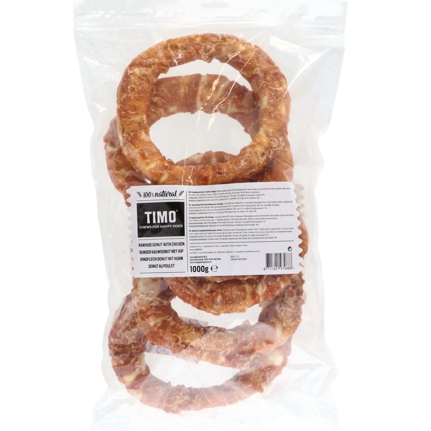| Samenstelling | Kip 40%, Ruwe huid 54%, Zetmeel 2%, Plantaardige Proteïne 2%, Glycerine 1,8%, Zout 0,1%, Kaliumsorbaat 0,1% |
