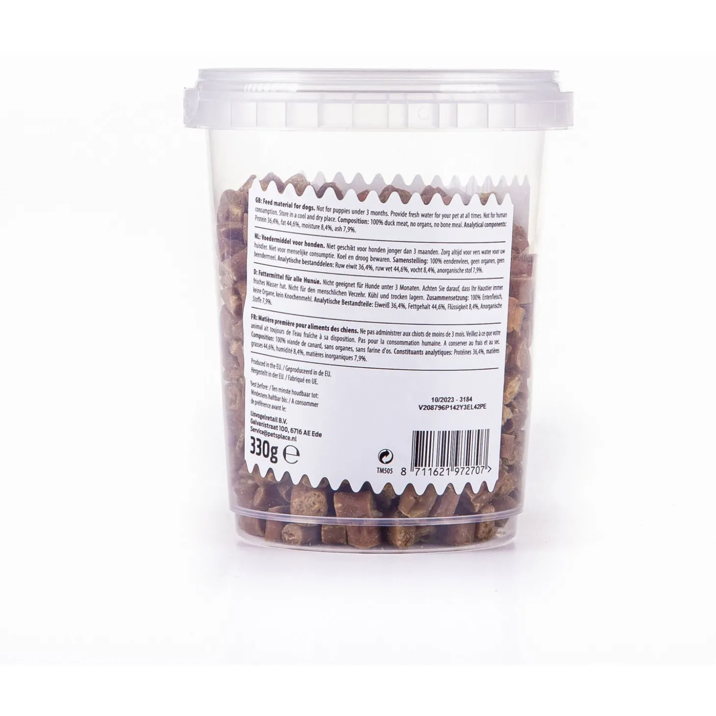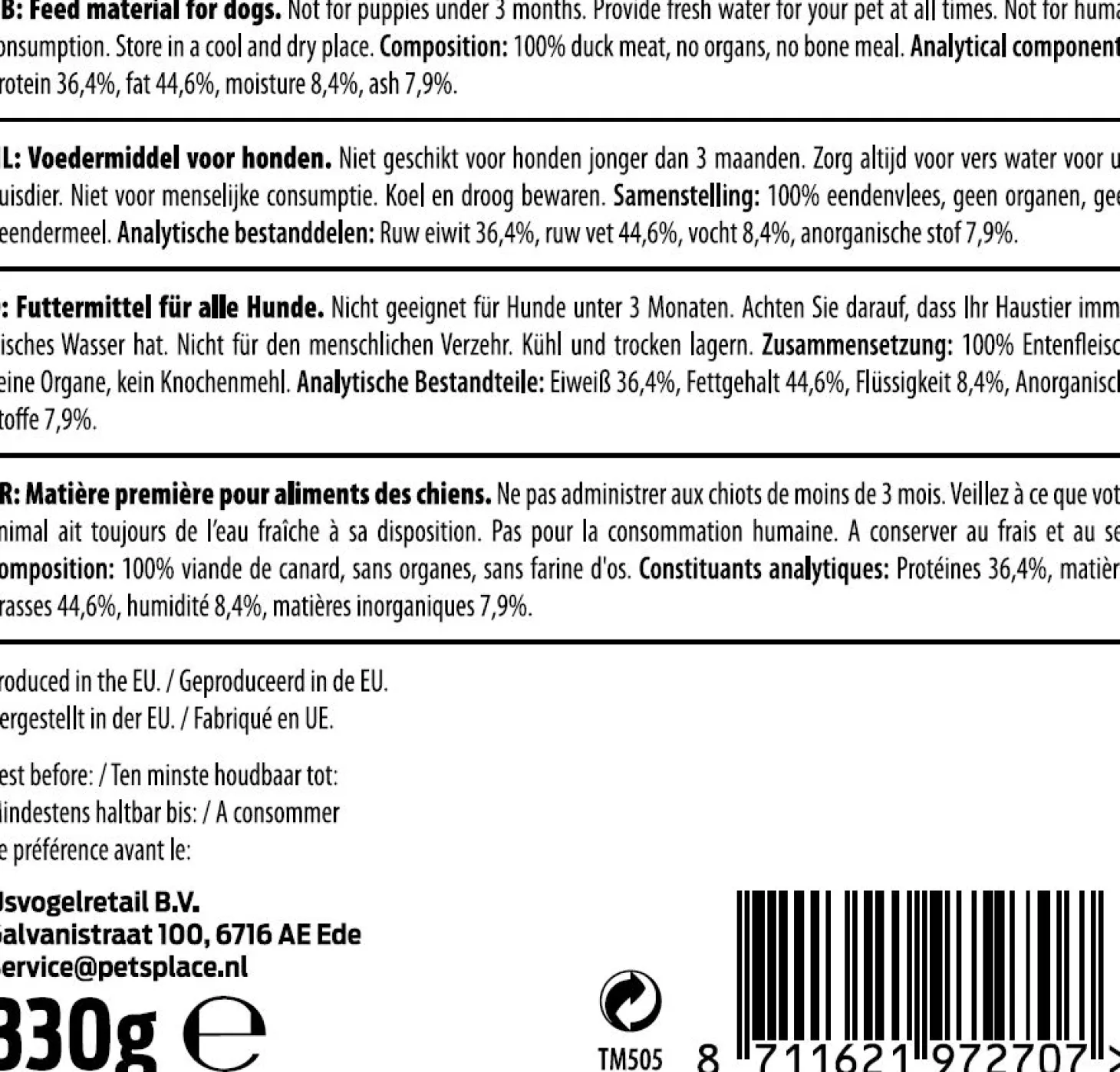 | Samenstelling | 100% eendenvlees, geen organen, geen beendermeel |