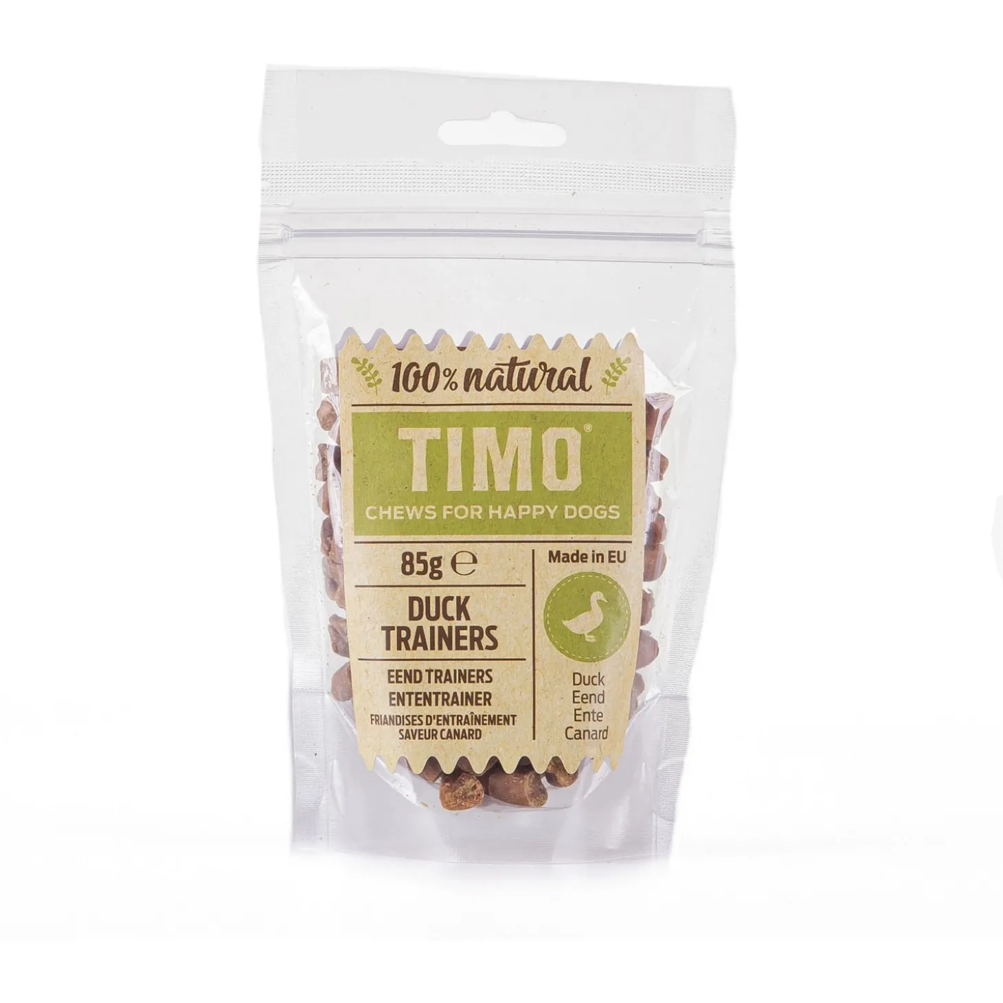 De Timo Trainers zijn verkrijgbaar in de soorten: eend, hert, konijn, paard, geit, zalm en lam. In 85 gram of 330 gram. Geschikt voor honden ouder dan 3 maand.