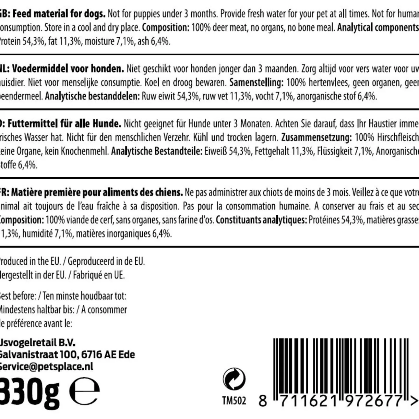 | Samenstelling | 100% hertenvlees, geen organen, geen beendermeel |