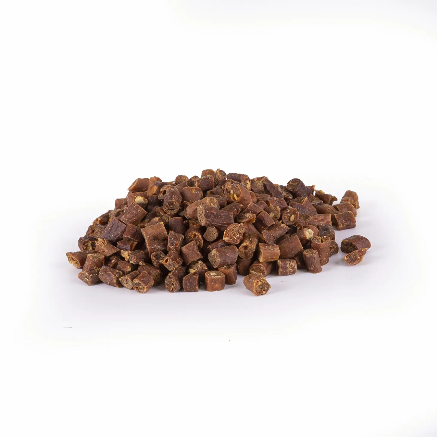 De trainers zijn gemaakt van 100% vers spiervlees, dus geen beendermeel of organen. Er is per variant 1 eiwitbron gebruikt, ideaal voor honden die gevoelig zijn voor bepaalde dierlijke eiwitten. Deze tussendoortjes zijn makkelijk verteerbaar en ondersteunen zo een optimale spijsvertering. Je voorziet je hond met Timo van een gezonde en natuurlijke snack, die ook nog eens is geproduceerd in Europa.