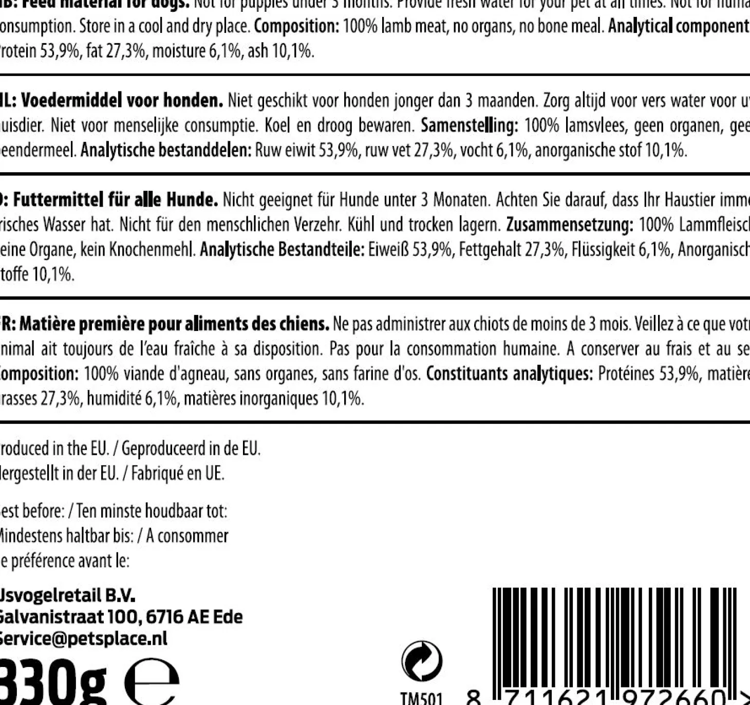| Samenstelling | 100% lamsvlees, geen organen, geen beendermeel |