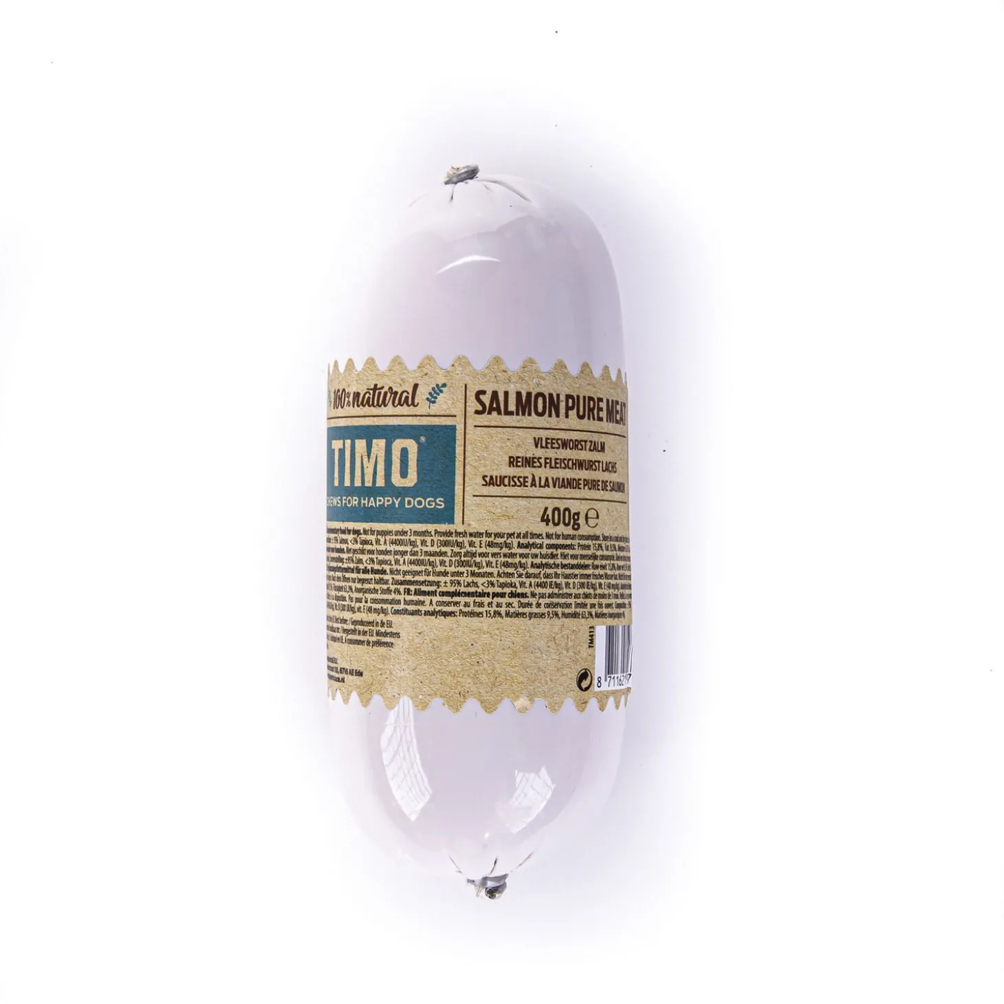 De Timo Vleesworst Zalm is verkrijgbaar in 200 en 400 gram. Geschikt voor honden ouder dan 3 maand.