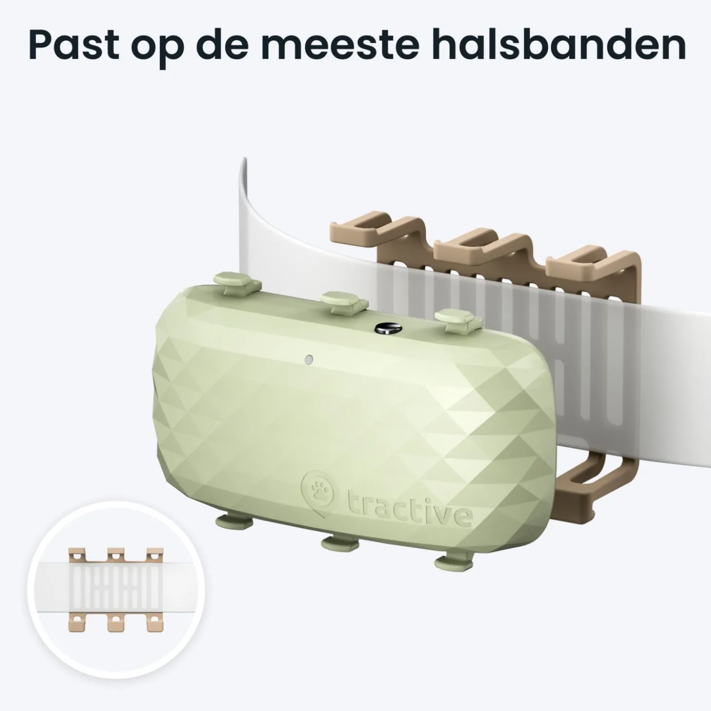 100% waterdichte, schokbestendige gps-tracker voor honden met een batterij die 1 maand meegaat. Past op de meeste halsbanden en tuigjes. Ontworpen voor honden vanaf 22 kg.