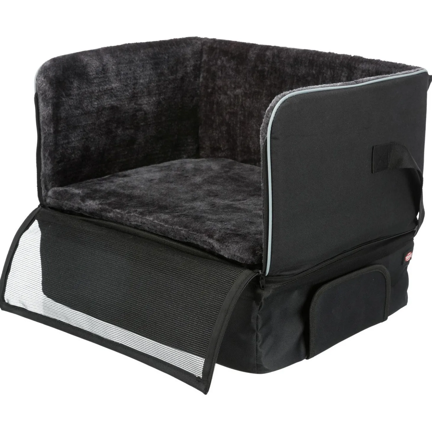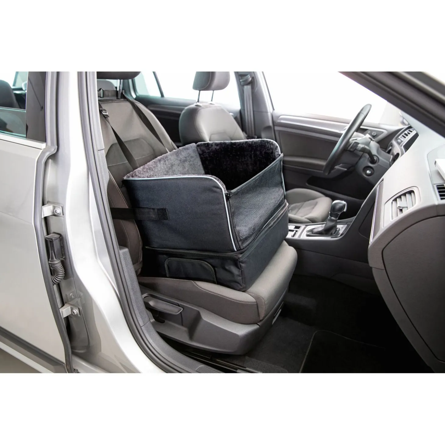 Deze autostoel gemaakt van nylon en pluche is geschikt voor het vervoer van kleine honden tot 8kg in de auto. De stoel is heel stevig en vormvast. Onder de mand zit een opbergvak waar alle spulletjes voor de hond heel handig in opgeborgen kunnen worden. Dit opbergvak dient gelijk als zitverhoging zodat de hond naar buiten kan kijken. De binnenkant is zacht en comfortabel. Het zitgedeelte is afneembaar en wasbaar op 30 graden Celsius. In de autostoel zit een uitsparing voor de veiligheidsgordel.