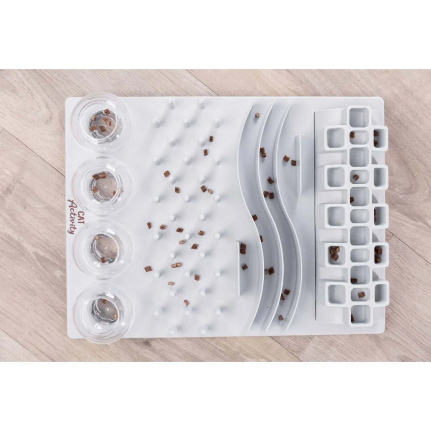 Spelen is voor de kat belangrijk voor zowel de geestelijke als lichamelijke gesteldheid. Voerpuzzels kunnen hierbij helpen, je kat krijgt z’n eten of traktaties niet gewoon in een voerbakje maar moet er moeite voor doen. Het Cat Activity Fun Board van Trixie is zo’n voerpuzzel.