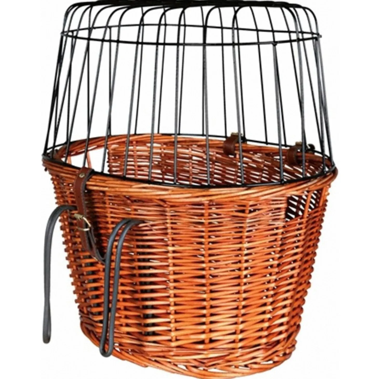 De mand zelf van deze fietsmand is gemaakt van wilgenteen. De draadkoepel bovenop heeft een kunststof coating. Je kan de mand met behulp van het mechanisme vastmaken aan je stuur. De koepel kan je met riempjes los en vast maken. Dankzij de koepel zit je hond veilig in de mand en kan deze er niet uitspringen, toch kan hij tegelijkertijd wel genieten van zijn omgeving met de wind in de haren! Door de twee uitsparingen aan de zijkant is de mand ook makkelijk op te pakken en te dragen.
