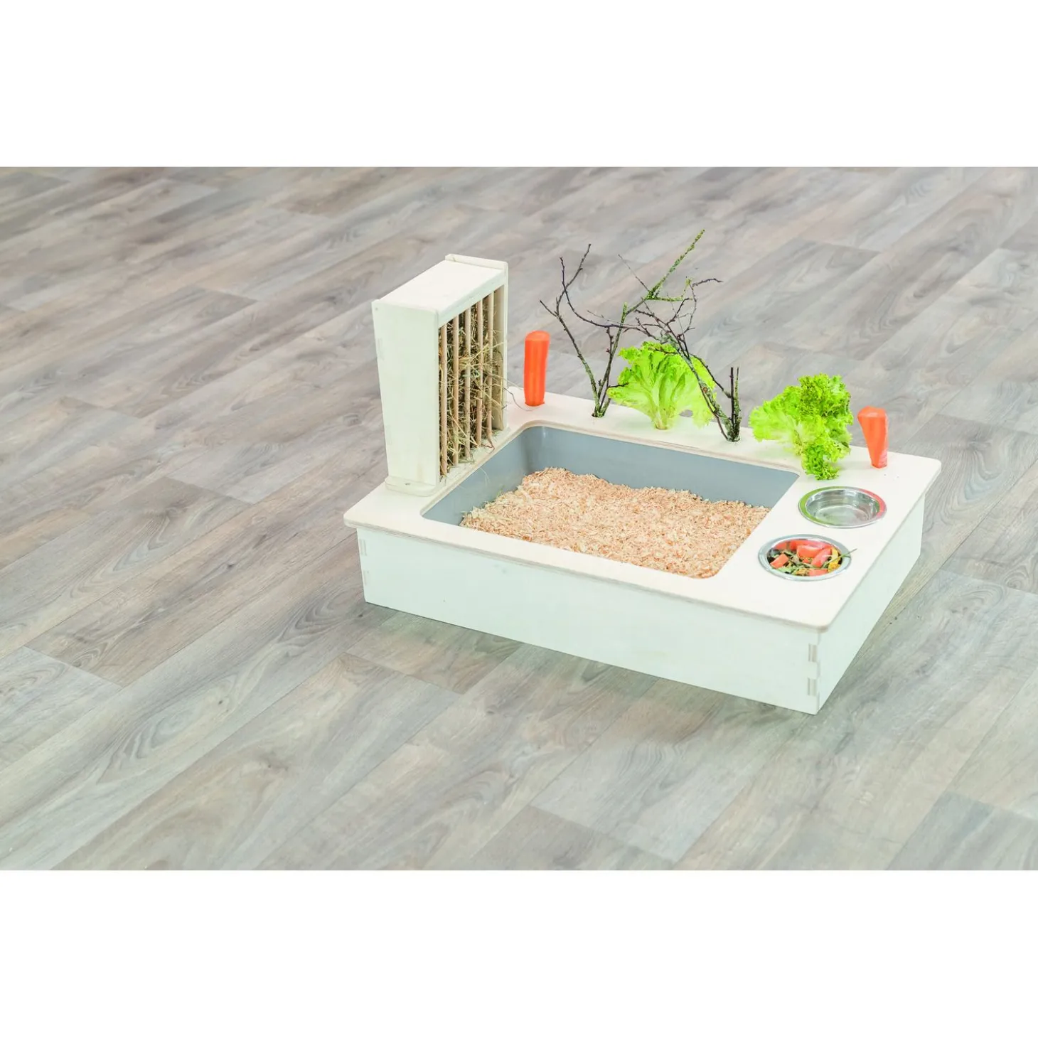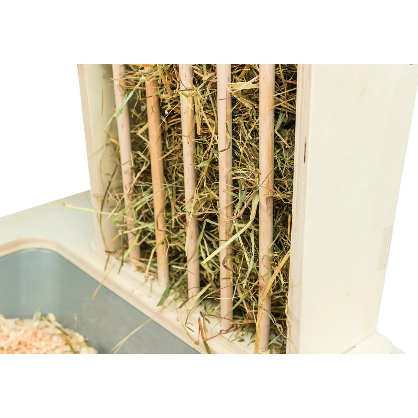 - Met 2 RVS-voer/waterbakken en hooiruif
