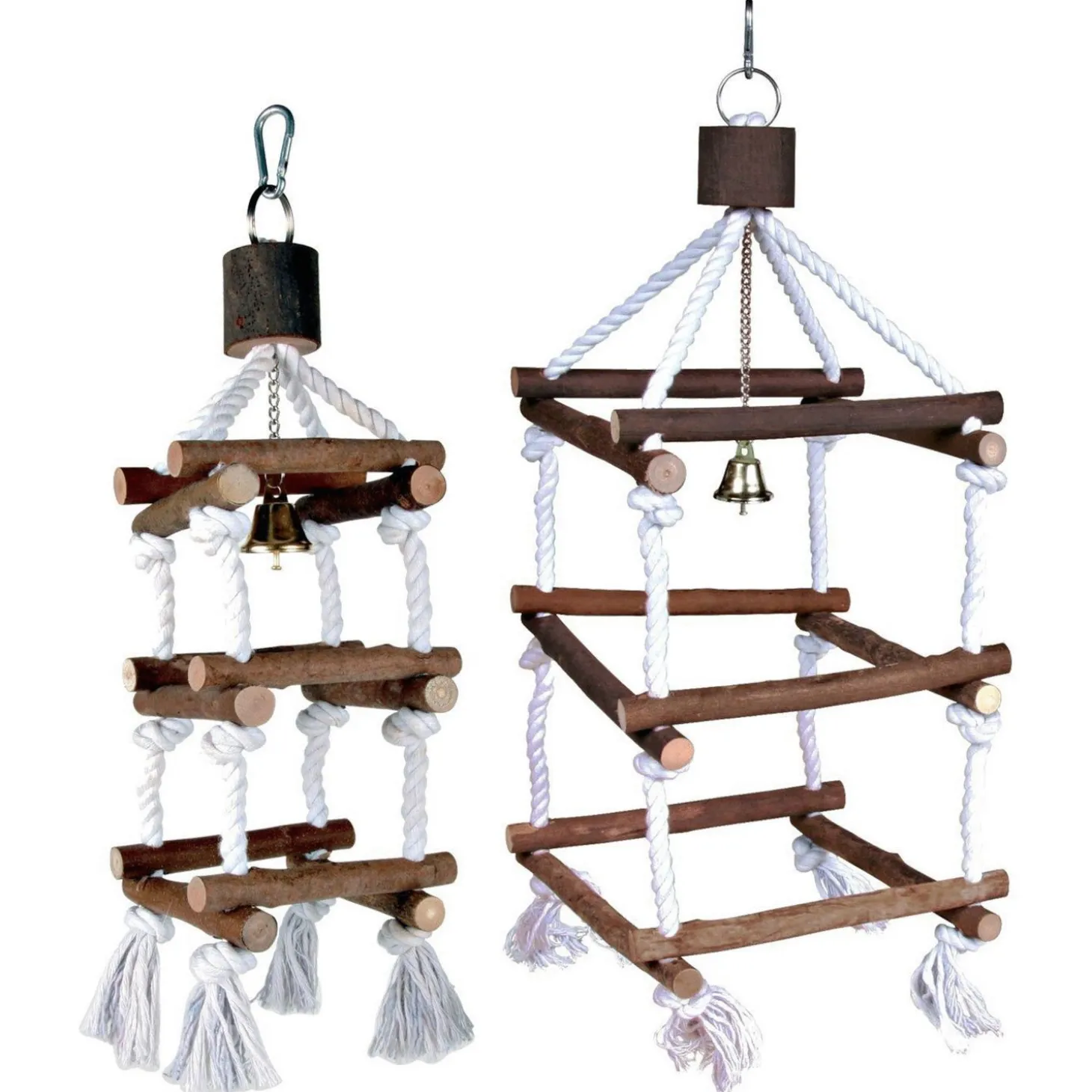 Het is gemaakt van natuurhout, het bestaat uit verschillende ‘verdiepingen’ en tussen elke ‘verdieping’ bevindt zich een touw waar jouw vogel mee naar boven kan klauteren. In het midden hangt een klokje. Al met al is het een erg leuk vogelspeeltje van goede kwaliteit.