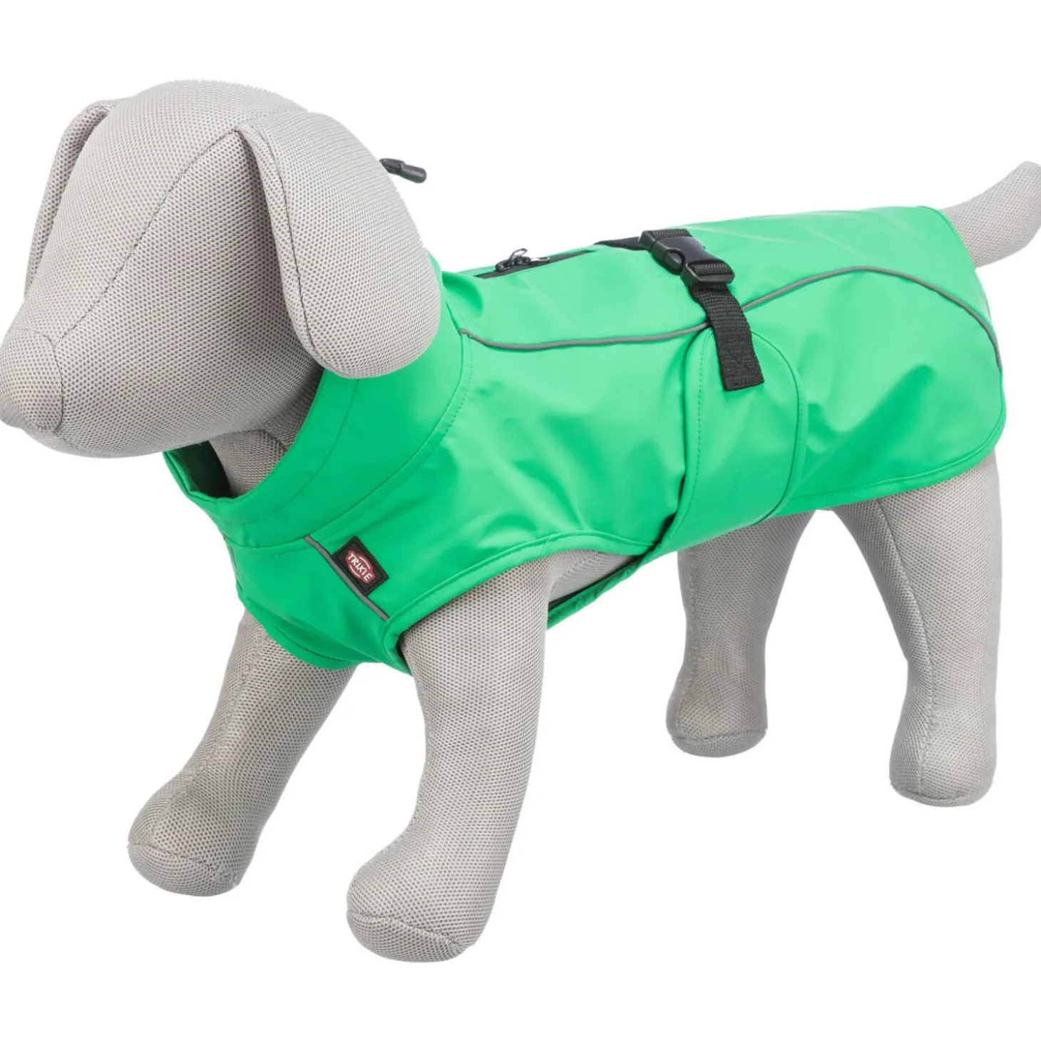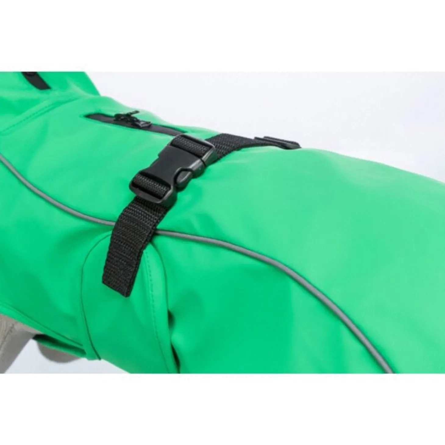 De jas van polyester is winddicht met waterdichte ritssluitingen. Je maakt de jas vast met een buikriem met gesp en de jas heeft verstelbare beenlussen voor de achterpoten, zodat de rug van de jas niet opwaait. Voor extra zichtbaarheid in regenachtige omstandigheden, heeft de jas ook reflecterende elementen.