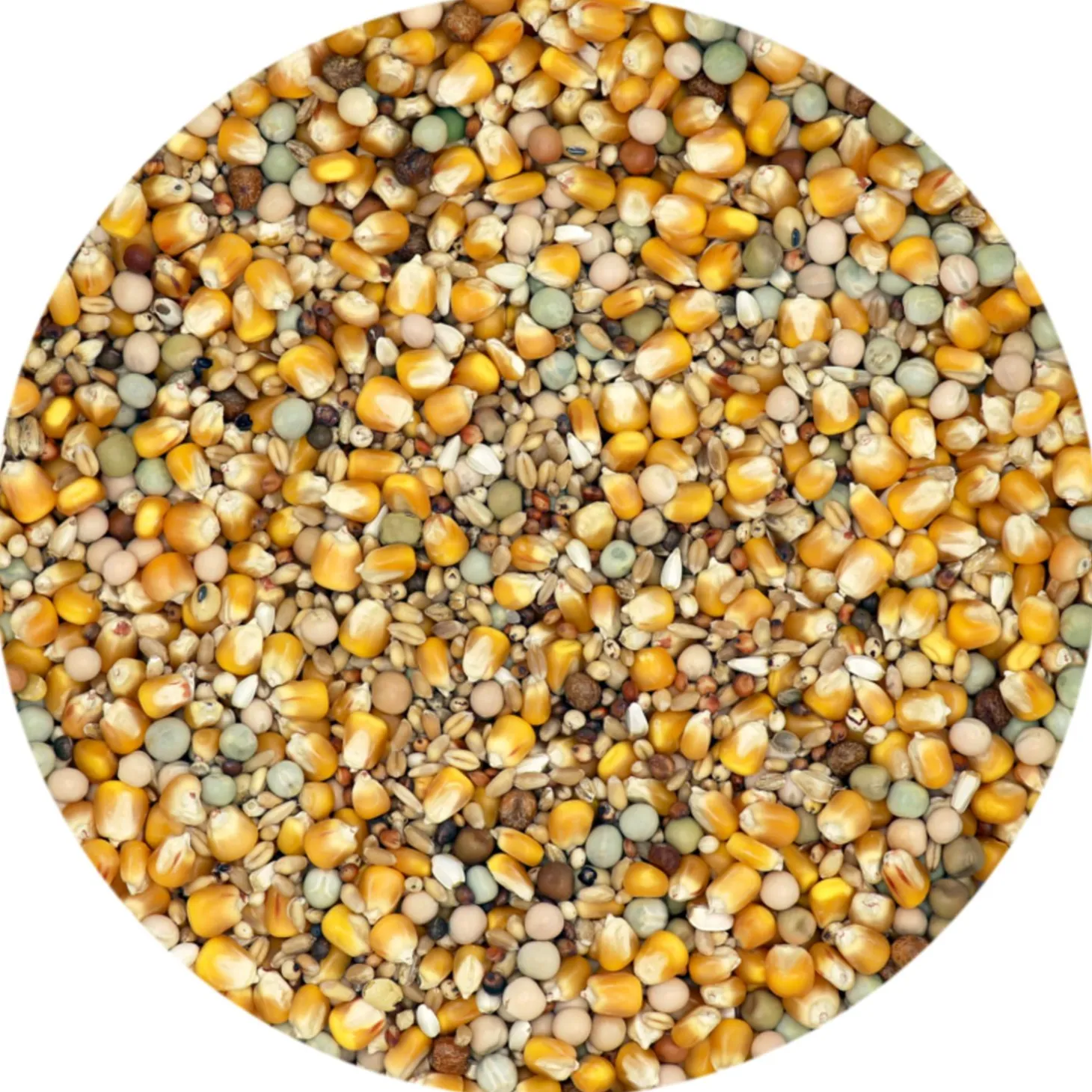 | Samenstelling | gele maïs 36,5% | maple peas 1,5% | dun peas 3% | gele erwten 10% | grote groene erwten 5% | tarwe 20% | gele dari 2,5% | rode dari 9% | cardy 2,5% | gepelde gerst 5% | gebroken rijst 0,5% | gepelde haver 1% | gele millet 1% | bruin lijnzaad 0,5% | zwart koolzaad 2% |