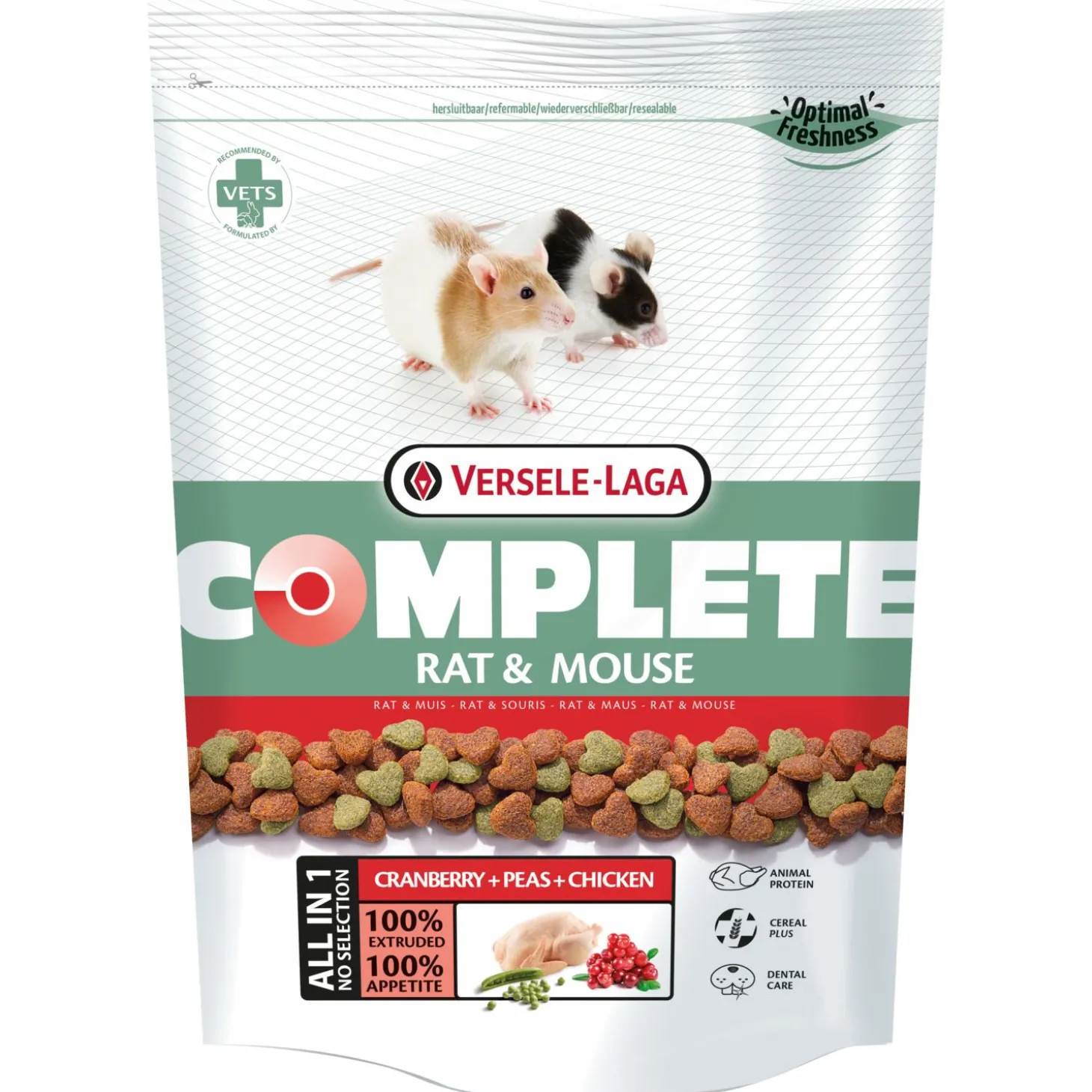 Een uniek concept op de dierenmarkt is het ‘All-in-one’ brokje. De Complete Rat & Mouse van Versele-Laga is een ‘All-in-one’ brokje. Deze bijzonder smakelijke korrel voorkomt selectief eetgedrag. Door het aanbieden van een ‘All-in-one’ brok zorg je ervoor dat jouw rat of muis alle essentiële voedingsstoffen binnenkrijgt. Deze voeding met kip als natuurlijke bron van dierlijke eiwitten en granen voor energie en vitaliteit is specifiek afgestemd op de voedingsbehoefte van ratten en muizen. Het toegevoegde lijnzaad draagt bij aan een goede opname en vertering. Door de optimale textuur van de brokjes zorgen ze voor een extra tandreiniging en geven tandplak minder kans. De voeding is verrijkt met erwten en veenbessen. Versele-Laga Complete Rat & Mouse is ontwikkeld door dierenartsen en gebaseerd op wetenschappelijke inzichten.