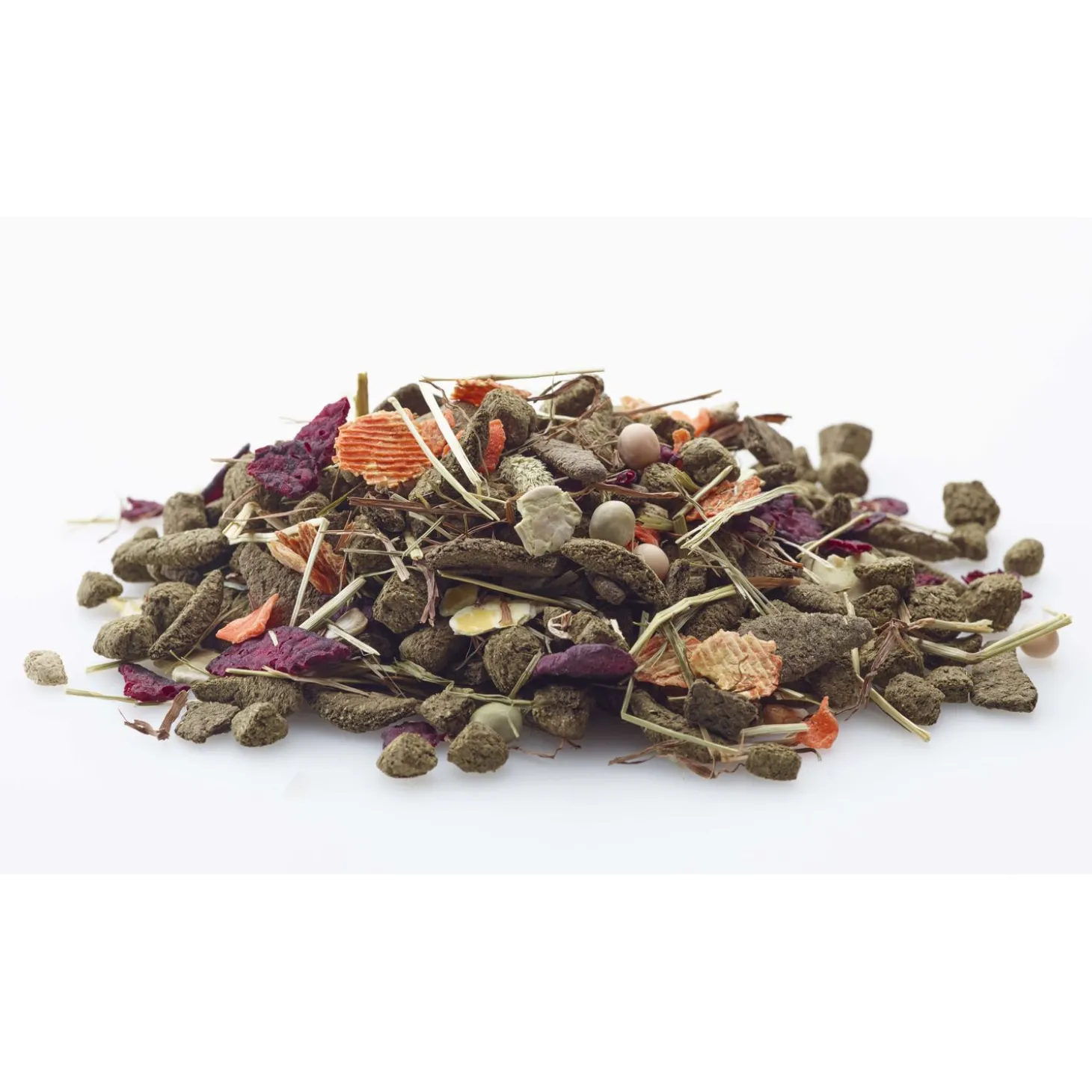 | Samenstelling | timothee hooi | gebroken johannesbrood | sojabonendoppen | gebroken erwten | zonnebloemzaadmeel | aardappelmeel | erwtenvlokken (5,5%) | paardenbonenvlokken (5%) | rode biet vlokken (4%) | wortelvlokken (3%) | sojameel | lijnzaad | gedroogde abrikozen | saffloerzaad | luzerne | monocalciumfosfaat | gedroogde wortels | rode klaver | getoaste sojabonen | gedroogde bietenpulp | natriumchloride | calciummagnesiumcarbonaat | veldbeemdgras | ruwe sojaolie | beemdlangbloem | Engels raaigras | kropaar | rietzwenkgras | smalle weegbree | witte klaver | Mojave-yucca | fructo-oligosachariden | mannan-oligosachariden | gedroogde algen | duizendblad | stevia | propyleenglycol | suiker |