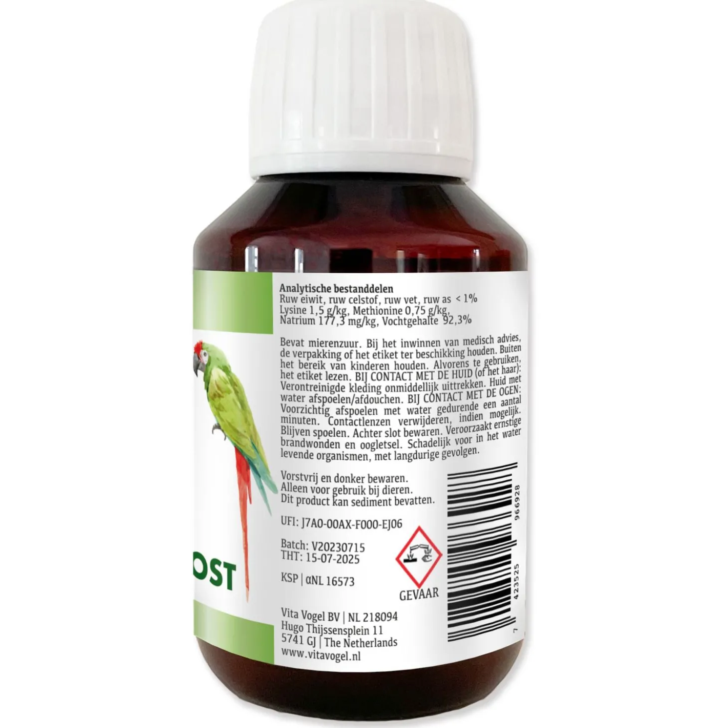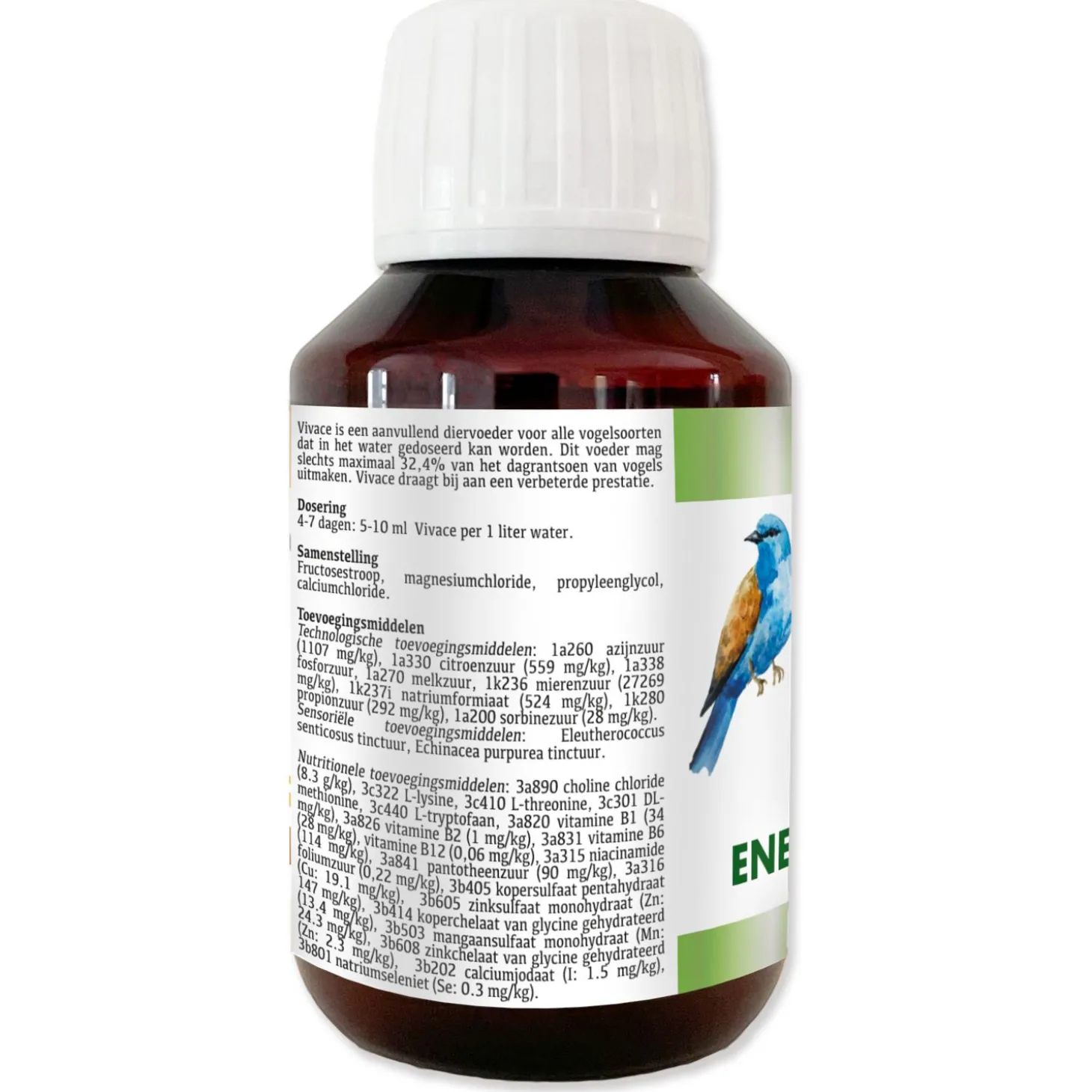 De unieke samenstelling van Vivace is ontwikkeld om extra energie te geven, bouwstoffen aan te vullen en het natuurlijke afweersysteem van je vogels een boost te geven. Vivace bevat vier cruciale aminozuren: methionine, tryptofaan, threonine en lysine, die essentieel zijn voor eiwitopbouw. Ook zijn koper, zink, magnesium en calcium aanwezig om de gezondheid te ondersteunen. Organische zuren in Vivace verbeteren de eiwitvertering, terwijl melkzuur en het prebioticum inuline de positieve darmbacteriën stimuleren. Het vitamine B-complex speelt een sleutelrol in de vertering van vetten, koolhydraten en eiwitten. Daarnaast bevat Vivace plantenextracten zoals Ginseng en Echinacea purpurea. Ginseng staat bekend om zijn ondersteuning van het afweersysteem, en Echinacea stimuleert de aanmaak van afweerstoffen. De directe energie in Vivace komt van glucose.