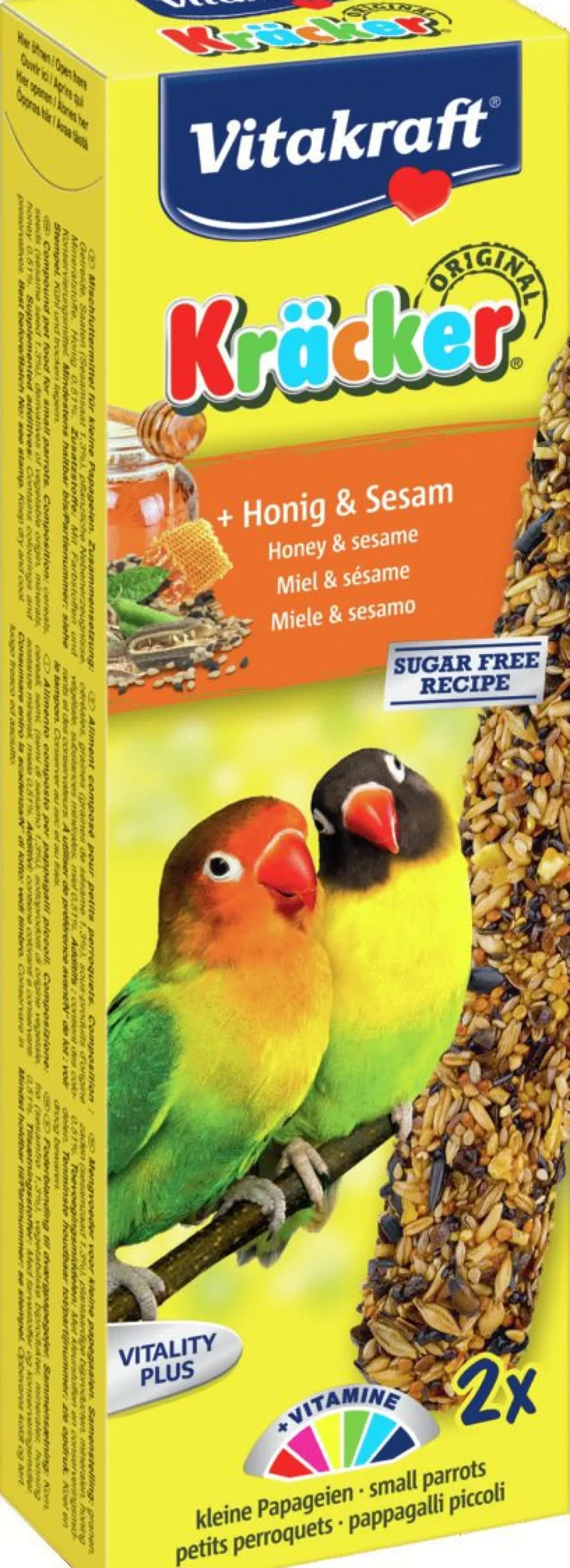 Agapornis Kracker is verpakt per 2 stuks in de smaak honing en sesam, dadel en amandel