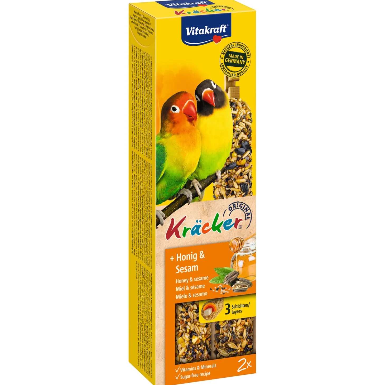 De Vitakraft Krackers stimuleren het natuurlijke gedrag van je vogel. Door de Kracker op te hangen moet de vogel moeite doen om al het lekkers te kunnen bemachtigen. Met zijn sterke snavel wordt hij uitgedaagd om de samengeperste zaden en lekkernijen los te wrikken. Een gezonde snack die staat voor gegarandeerd smul plezier!