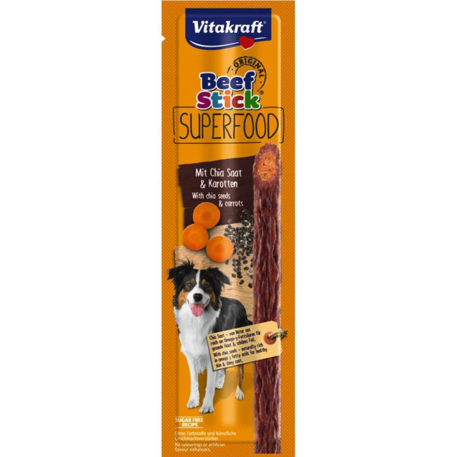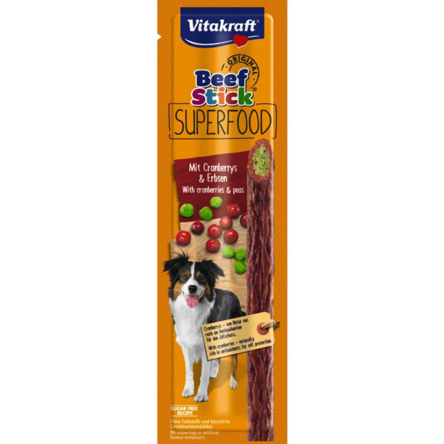 Beefstick Hond Superfood van Vitakraft is verpakt per stuk in de smaak rund-erwt-cranberry en rund-chiazaad-wortel