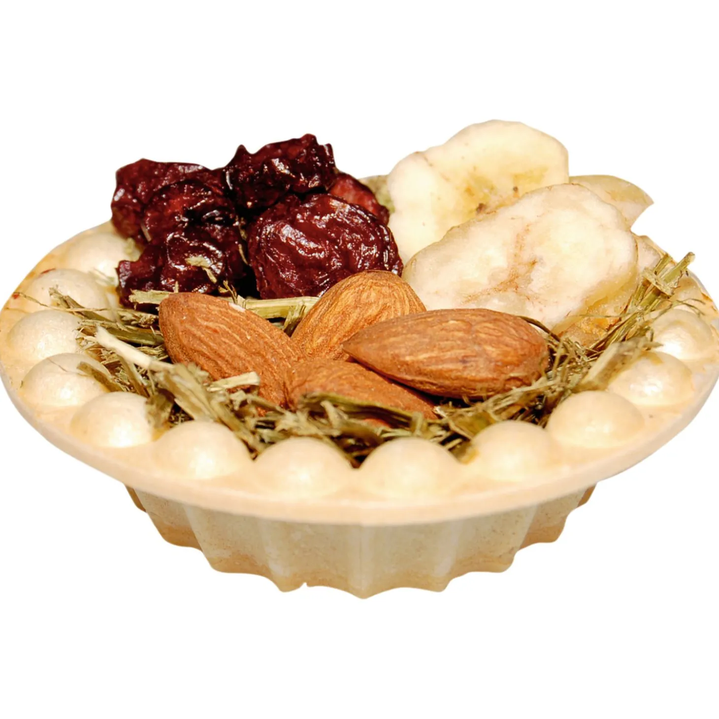 | Samenstelling | Plantaardige bijproducten (luzerne 40,5%), fruit (banaan, gedroogd 15,9%, kersen, gedroogd 5,4%), noten (amandelen 18,9%), bakkerijproducten (wafel 16,2%), oliën en vetten |