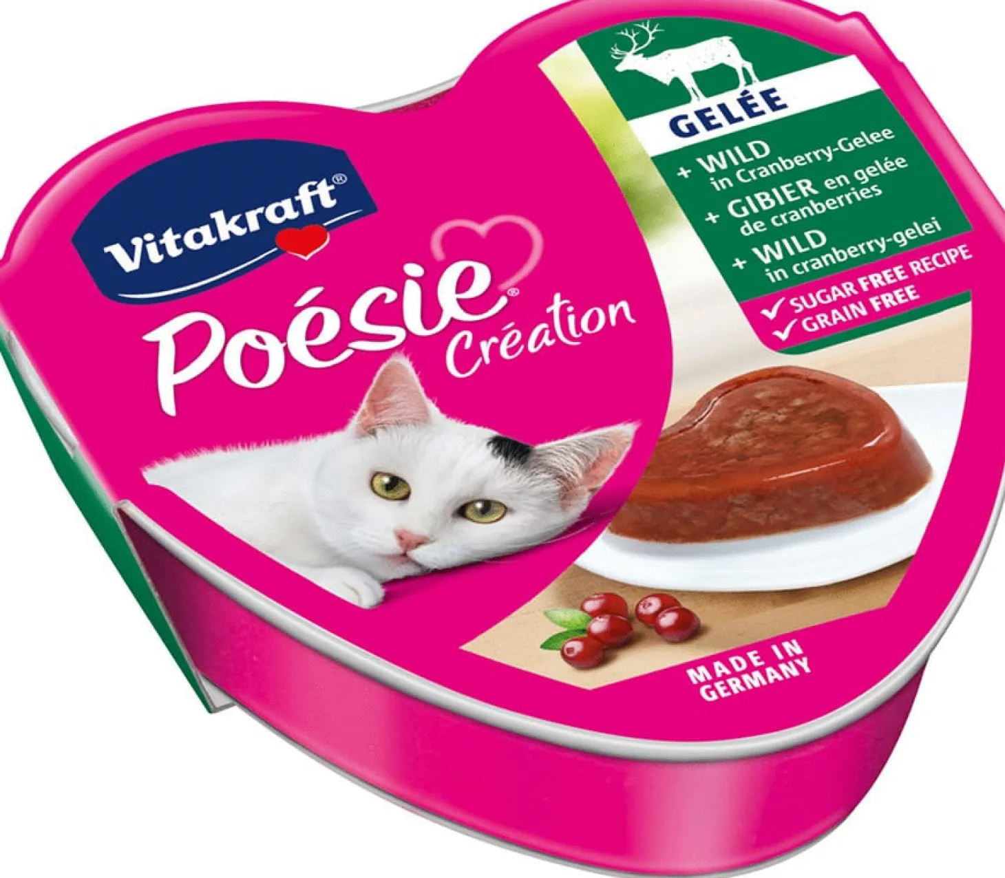 De Poésie Gelei van Vitakraft is een heerlijke smeuïge substantie met smakelijke verse ingrediënten. De gelei is een gezonde natvoeding en volledig afgestemd op de voedingsbehoeften van de volwassen kat. De gebruikte ingrediënten zijn van de hoogste kwaliteit en zijn bereid volgens een suikervrij receptuur. Heerlijk vlees aangevuld met fruit of groente voor een onweerstaanbare smaak!