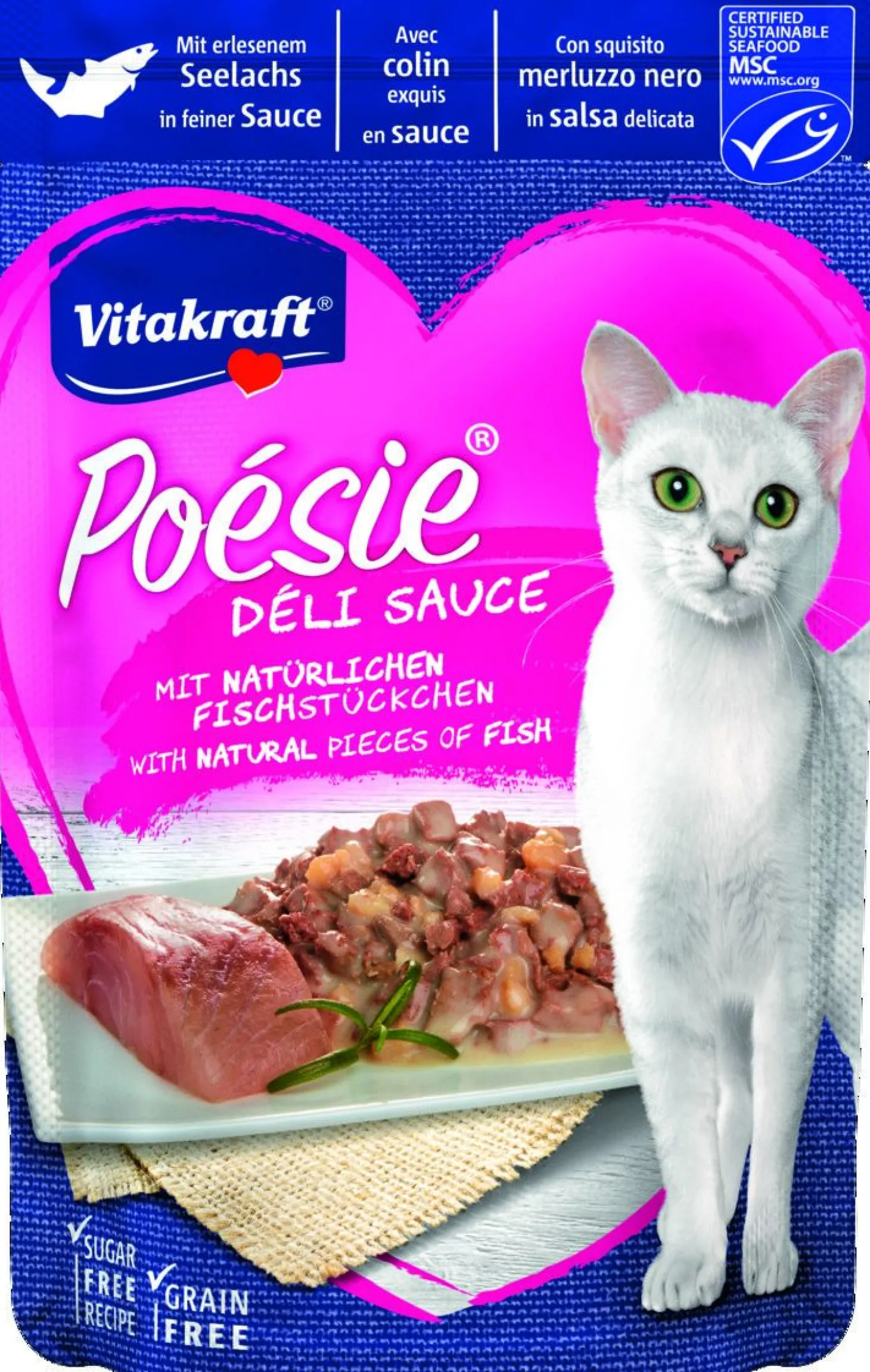 Naast een goede voeding mag jij je kat ook wel eens verwennen. Met de Poesie Deli Saus van Vitakraft weet je zeker dat het goed zit. Laat je kat keer op keer genieten van de onweerstaanbare smaak. Een natvoeding bestaande uit zachte stukjes hoogwaardige kipfilet, kalkoenfilet of kabeljauw afkomstig uit MSC gecertificeerde duurzame visserij, in een verrukkelijk sausje. Om je bek bij af te likken. Een complete voeding gemaakt van de beste ingrediënten en perfect afgestemd op de voedingsbehoeften van volwassen katten.