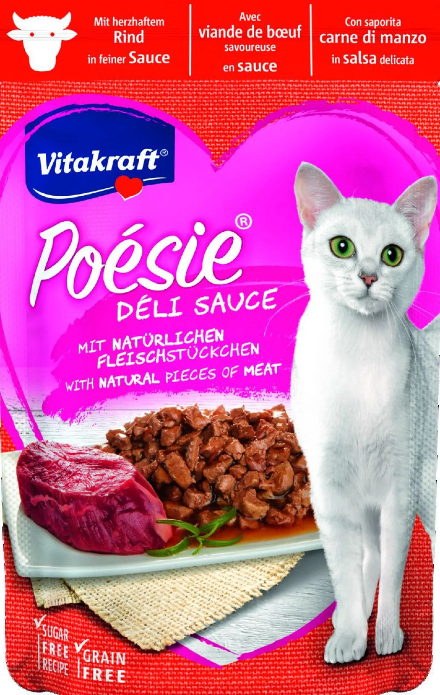 Poesie Deli Sauce is verkrijgbaar in een pouch van 85g, in de smaak kip, kalkoen of kabeljauw