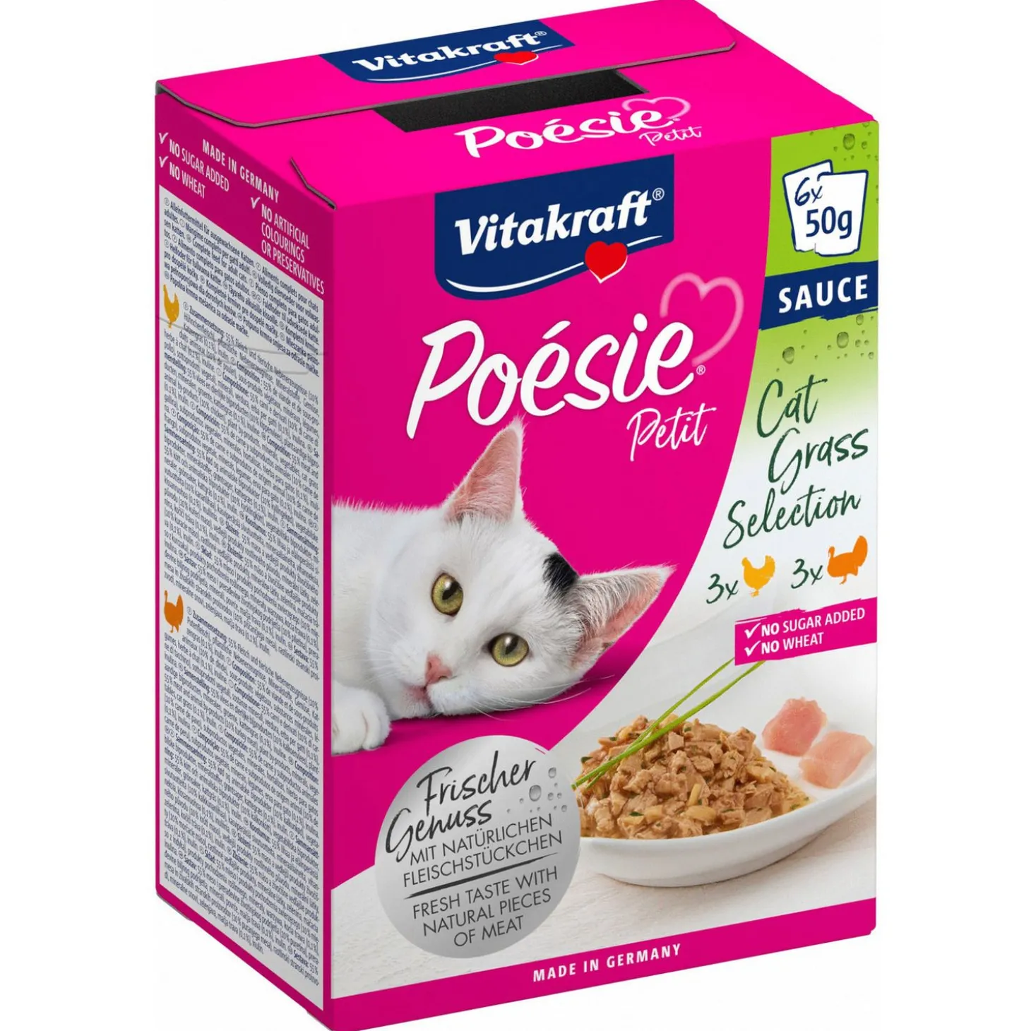 | Samenstelling | Samenstelling: Met Kip: 55% Vlees en dierlijke bijproducten (10% Kip), Plantaardige bijproducten, mineralen, groenten, Kattengras (0,1%), inuline, – Met kalkoen: 55% vlees en dierlijke bijproducten (10% kalkoenvlees), plantaardige bijproducten, mineralen, groenten, kattengras (0,1%), inuline. |