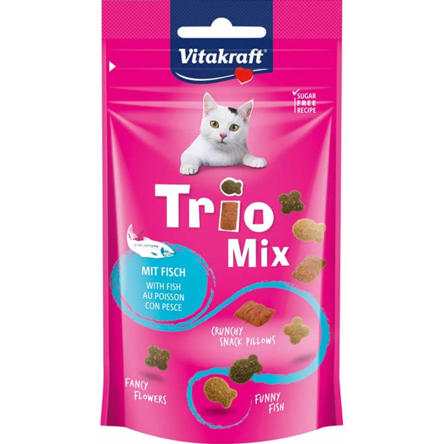 De heerlijke krokante Trio Mix van Vitakraft is een gevarieerde snack voor je lieve huistijger. In deze mix zitten drie verschillende krokante snackjes op basis van gevogelte. Een rondje, een kruisje en natuurlijk de gevulde kussentjes. Bereid volgens een suikervrij receptuur en verpakt in een handige hersluitbare verpakking!