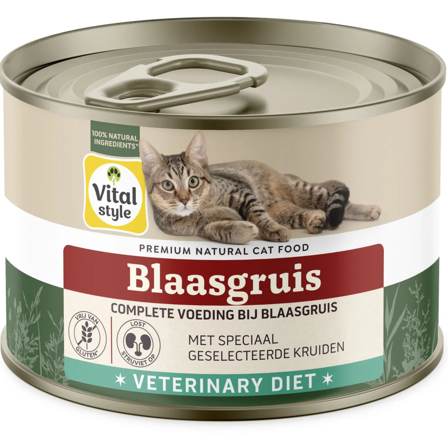 BLAASGRUIS van VITALstyle is een heerlijke natvoeding voor bvolwassen katten met blaasproblemen. De voeding bevat diverse ingrediënten met een hoog vleesgehalte. Het gebruikte vlees is van hoge kwaliteit en heeft een mooie structuur. De natvoeding heeft een urineverzurende werking die helpt om het al aanwezige blaasgruis (struviet) te verminderen en voorkomt de vorming ervan.