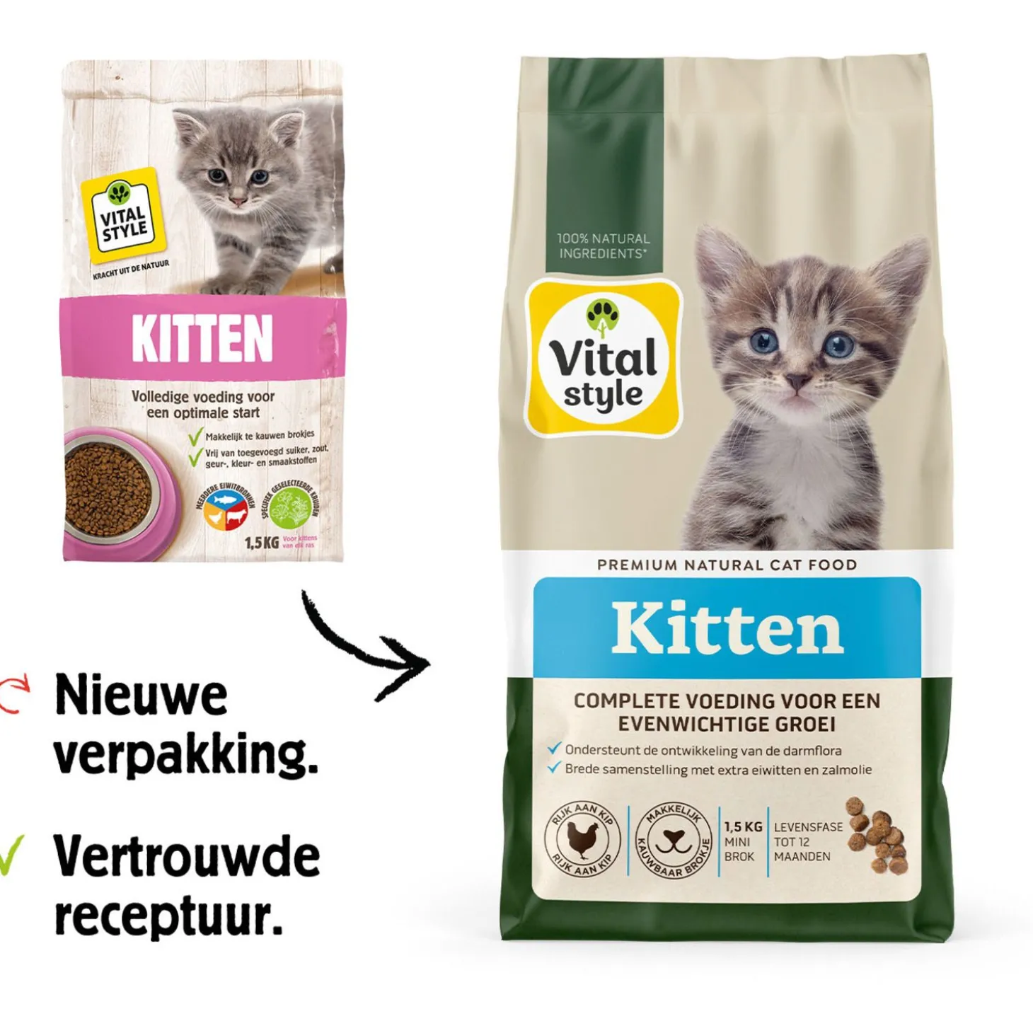 Met VITALstyle Kitten 1,5 kg bied je je kitten de perfecte basis voor een gezond en sterk leven. Extra eiwitten, een uitgebalanceerde kruidenmix en prebiotica geven jouw kleine huistijger alles voor groei, weerstand en vitaliteit. Bestel nu en zie je kitten volop groeien en stralen!
