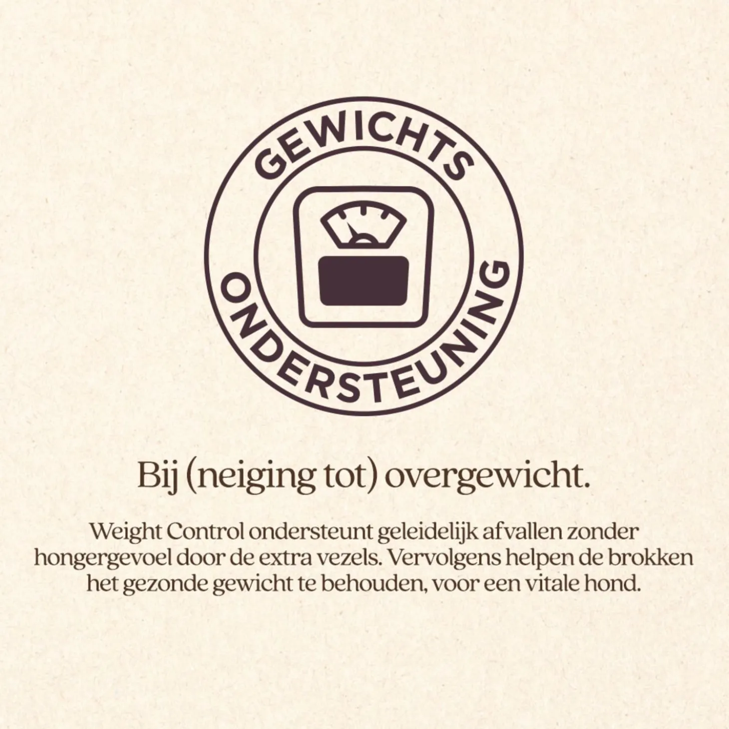| Aanbeveling | De aangegeven hoeveelheid voer is een richtlijn voor de dagelijkse voerbehoefte van jouw hond. De individuele behoefte van jouw hond kan variëren en hangt onder andere af van activiteit, leeftijd en ras. Aangezien het belangrijk is dat uw huisdier de juiste hoeveelheid voeding krijgt, raadpleeg het etiket/verpakking voor het complete, gedetailleerde voedingsadvies.Weight Control is geschikt voor volwassen honden van elk ras. Verdeel de hoeveelheid in twee maaltijden per dag. Voor een optimaal resultaat is het advies om alleen deze voeding aan jouw hond aan te bieden. Houd de conditie van jouw hond goed in de gaten en zorg altijd voor vers drinkwater. |