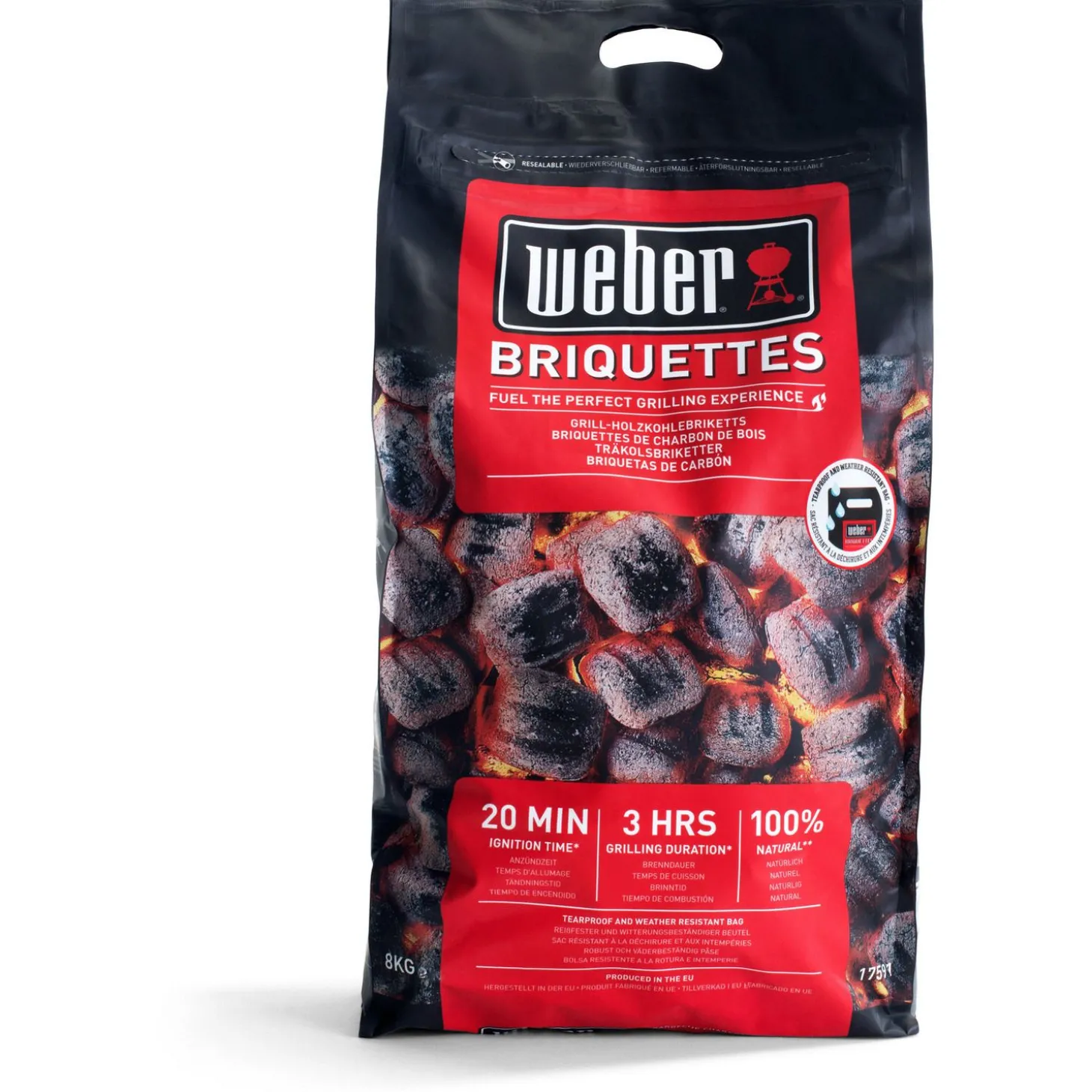 Deze langdurig brandende, 100 procent natuurlijke houtskoolbriketten worden gemaakt van gecarboniseerd hout, zetmeel, en water, wat onder een druk van 50 ton gecomprimeerd wordt tot briketten die schoon branden, minder stof produceren, en tot drie uur lang branden – zonder enige vorm van toegevoegde chemicaliën. Bovendien hebben de nieuwe Weber Briketten een extra grote kussenvorm en dubbele groeven om de luchtcirculatie te bevorderen en te zorgen voor een sneller onstekingsproces.