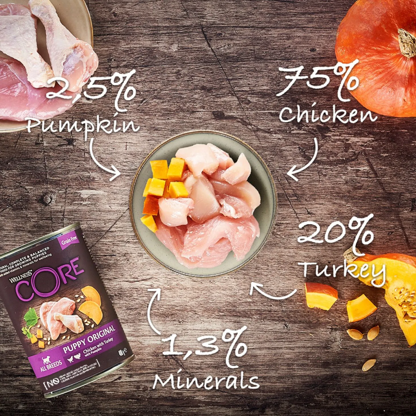 | Samenstelling | 75% kip (47% (hart, lever, vlees, nek), 28% kippenbouillon), 20% kalkoen (hart, lever, vlees, nek), 2,5% pompoen, 1,3% mineralen, 1% banaan, 0,2% visolie (bron van DHA). |