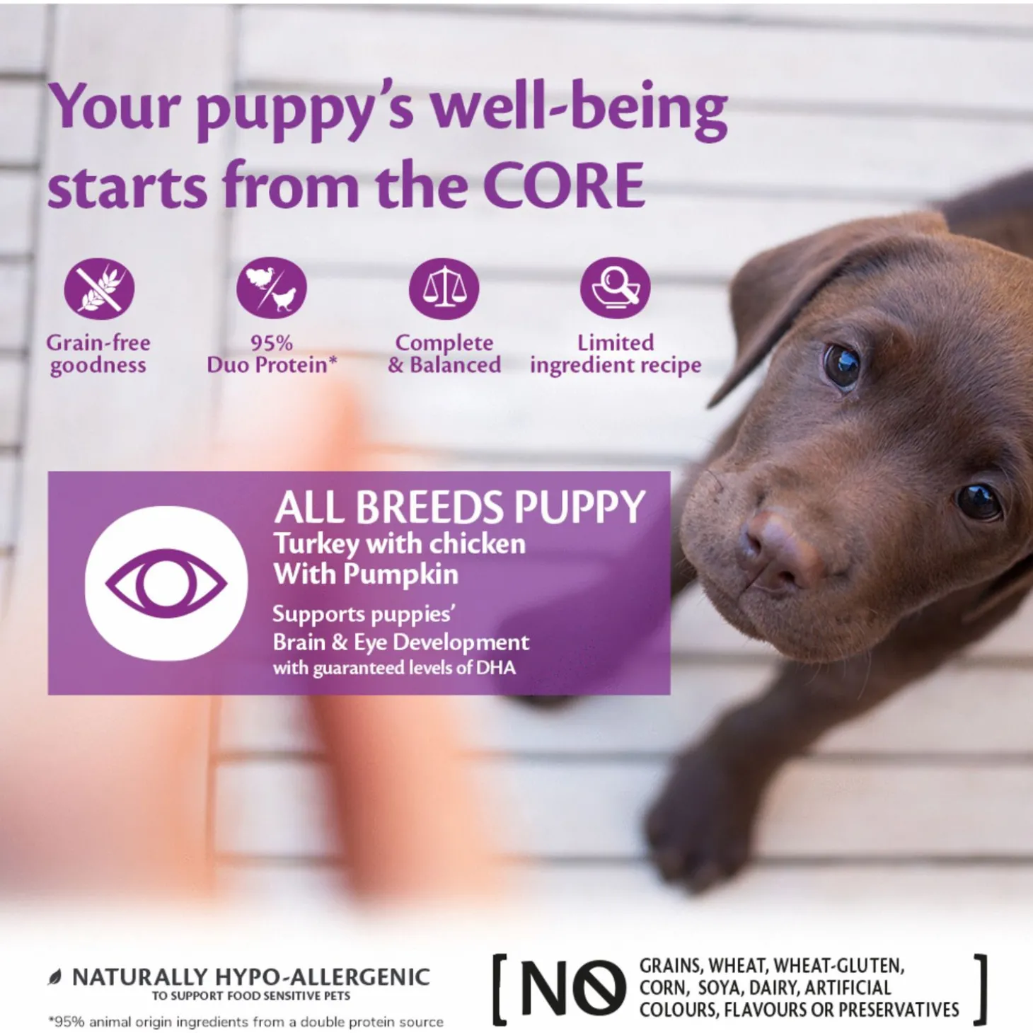 Grain Free 95% is volledig hypoallergeen, het bevat geen granen, tarwe, gluten maïs, soja, zuivel en ook geen kunstmatige geur-, kleur- en smaakstoffen. Een heerlijke vleesrijke maaltijd waarmee je puppy gezond zal opgroeien.