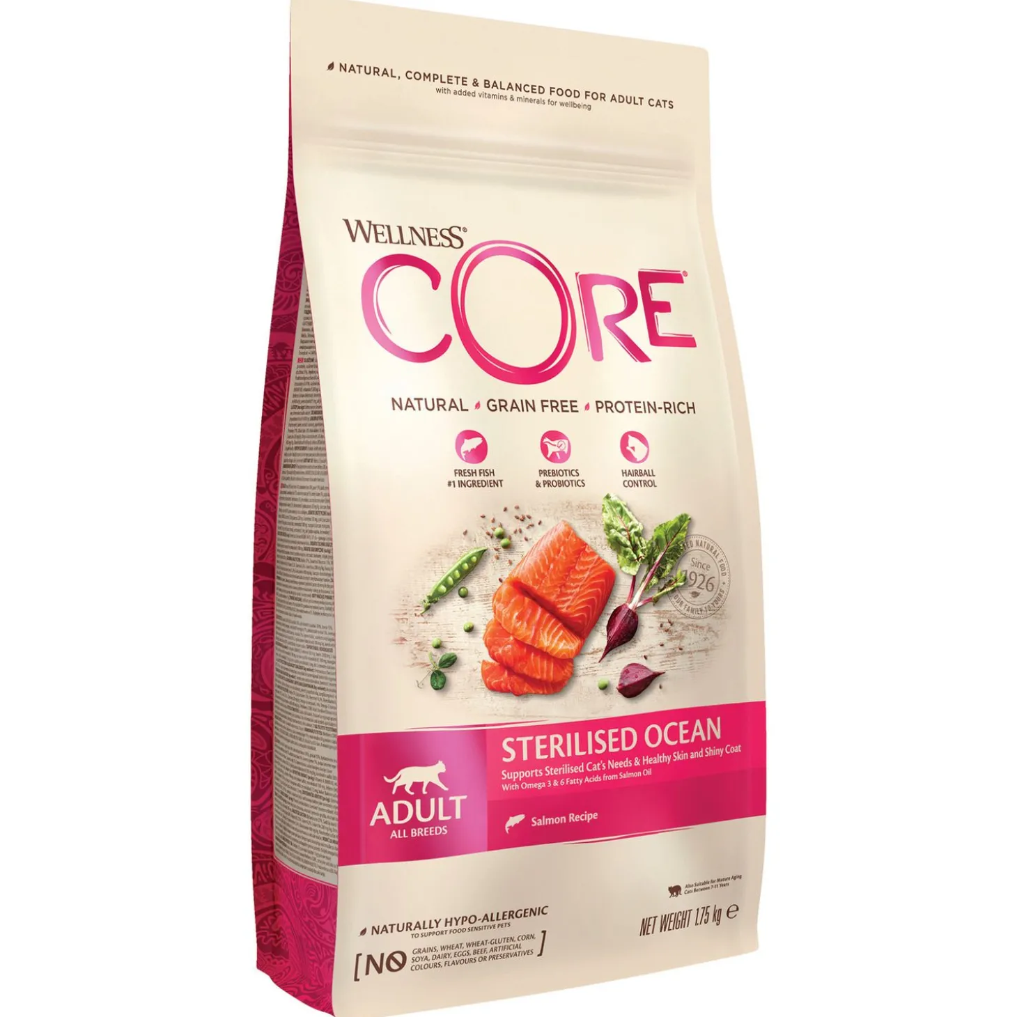 Je wilt je kat natuurlijk de beste van de beste brokken aanbieden. Wellness Core Sterilised Zalm is een natuurlijke en complete voeding voor gesteriliseerde/gecastreerde, volwassen katten, met toegevoegde vitaminen en mineralen. Een voeding rijk aan proteïnen met verse zalm dat wordt aangevuld met onder andere gezonde groenten, superfoods, kruiden en voedingssupplementen. De voeding is daarnaast ook nog eens graanvrij.